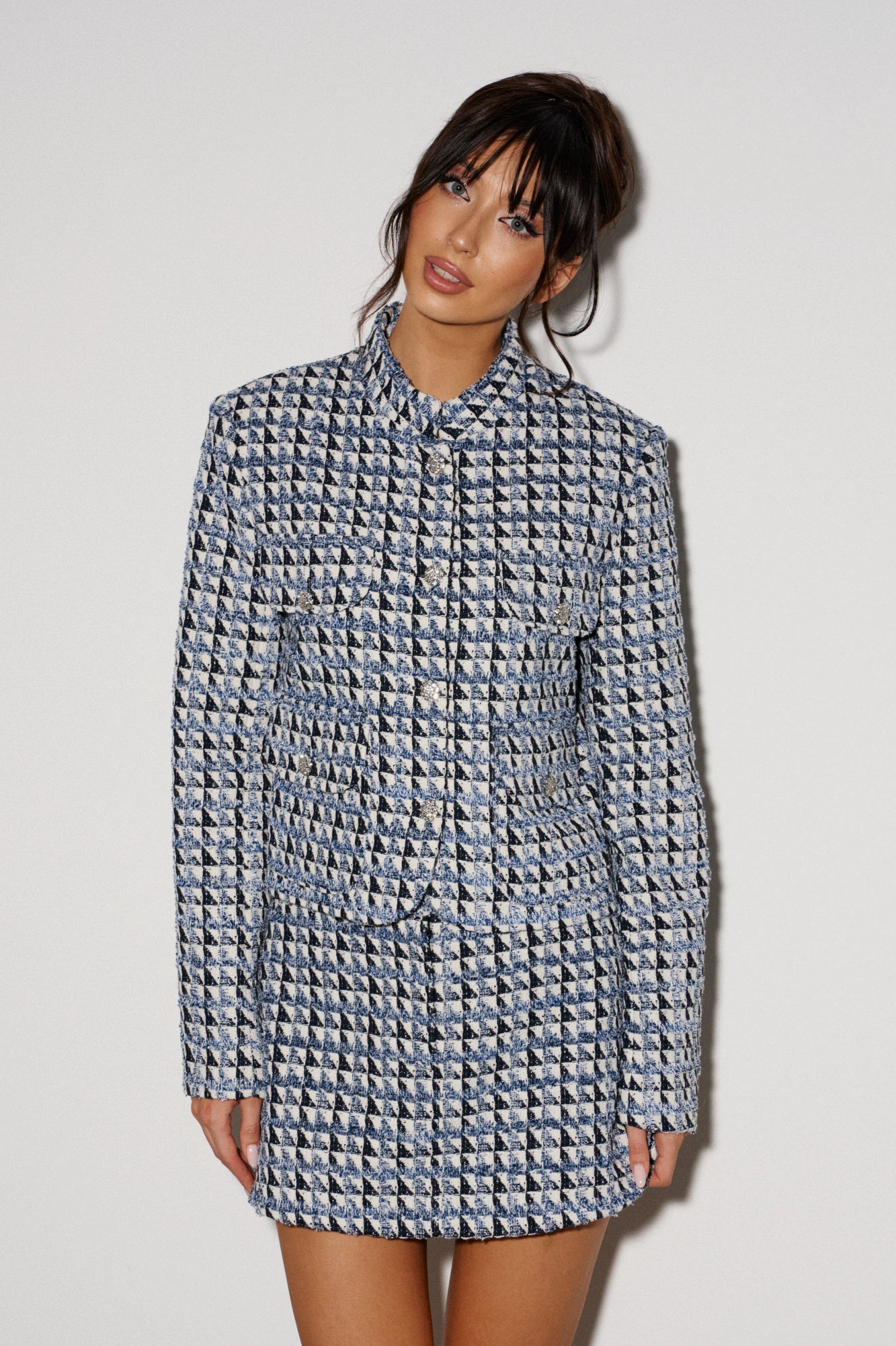 Юбка силуэт трапеция, выполнена из твидовой ткани. Характеристики: стабильный пояс, застежка центральная на петлю-пуговицу и потойную молнию. Брендированная подкладка. В боковых швах карманы. Длина по задней части изделия 35см.