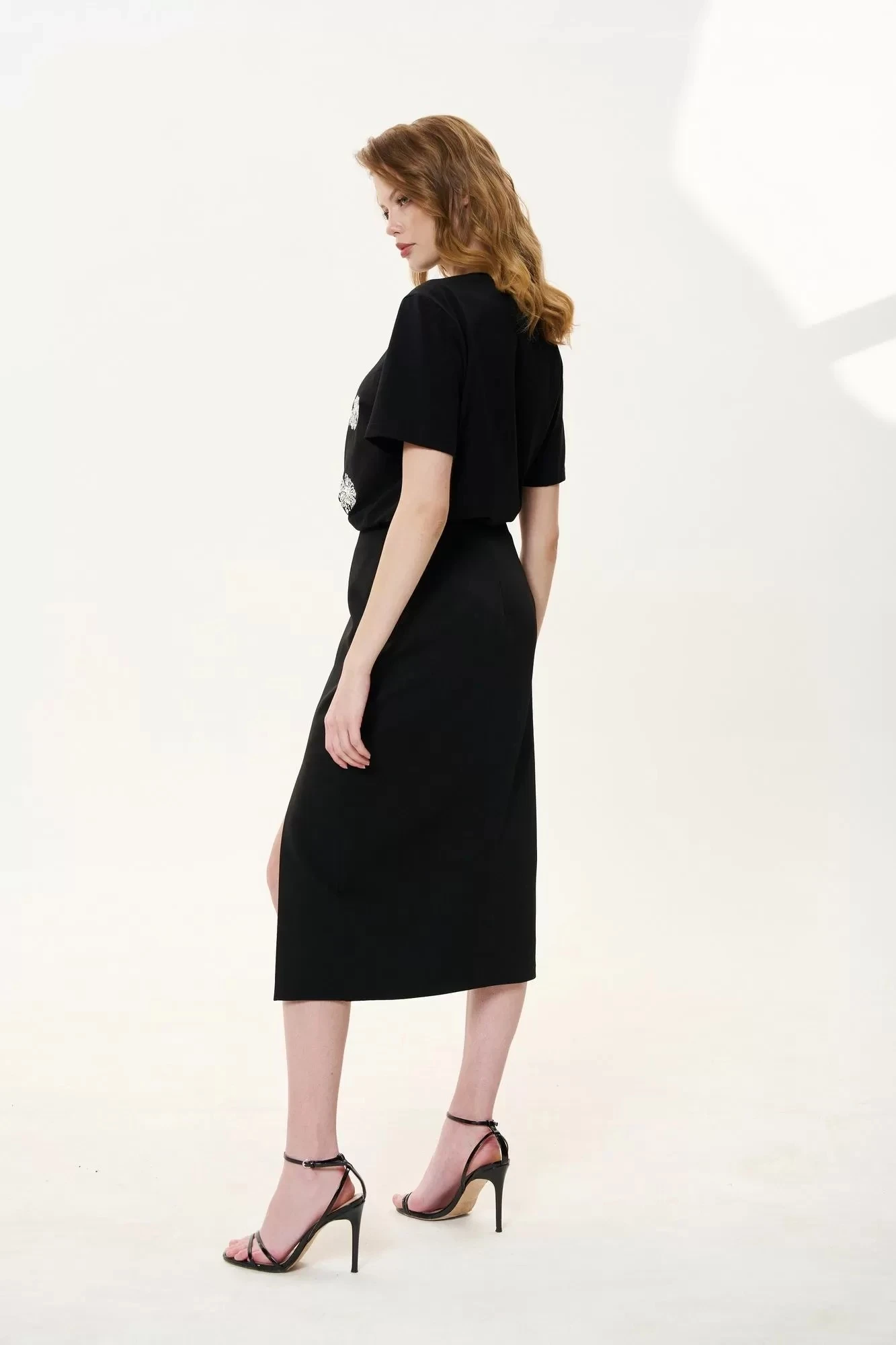выполнена из костюмной ткани в черном цвете, юбка на подкладке, застежка-молния по заднему полотнищу юбки, верх юбки обработан поясом-обтачкой.