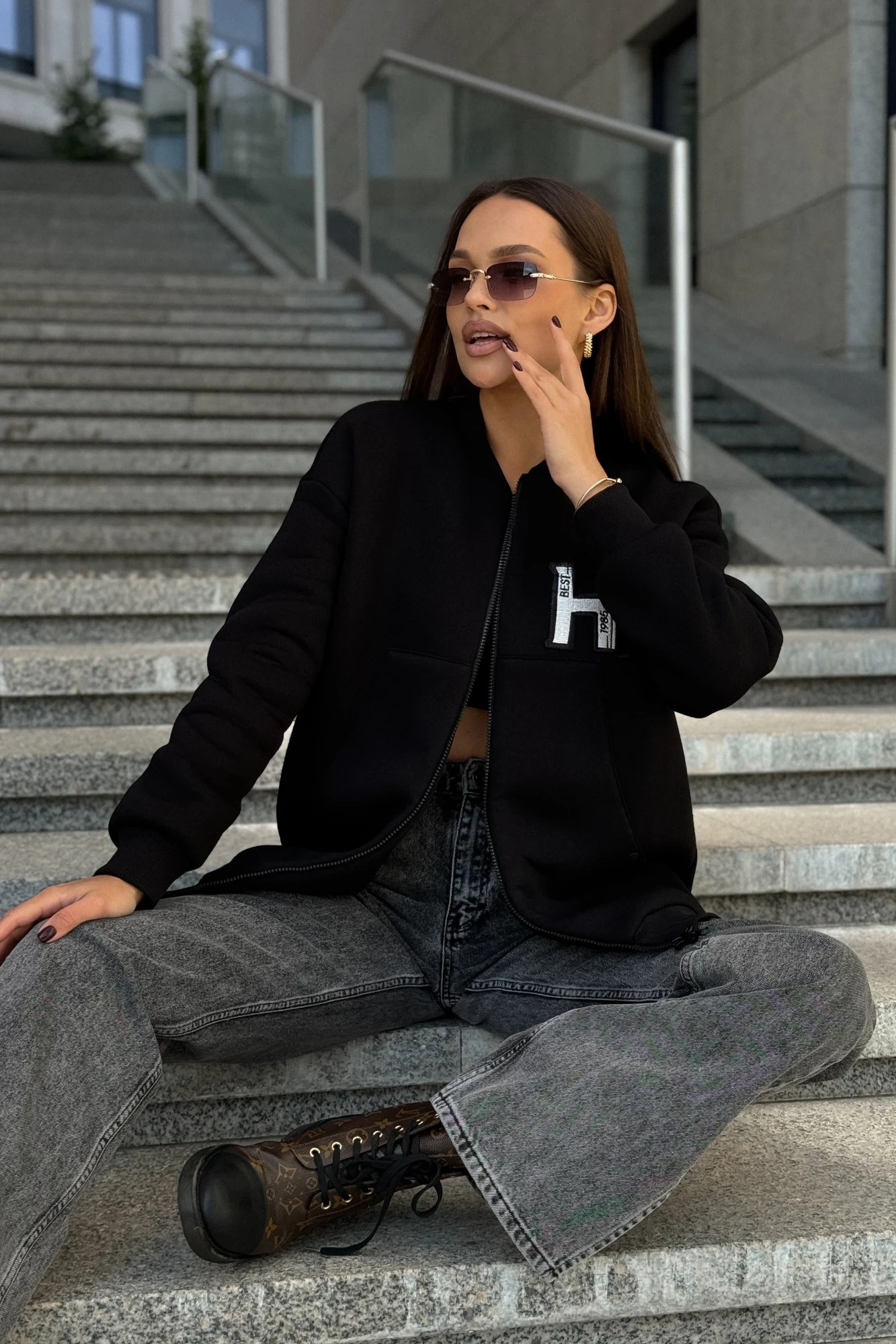 Рукава втачные, одно шовные. По низу рукава притачные манжеты из отделочной ткани. Воротник стойка с закругленным концом из отделочной ткани. Бомбер на подкладке.