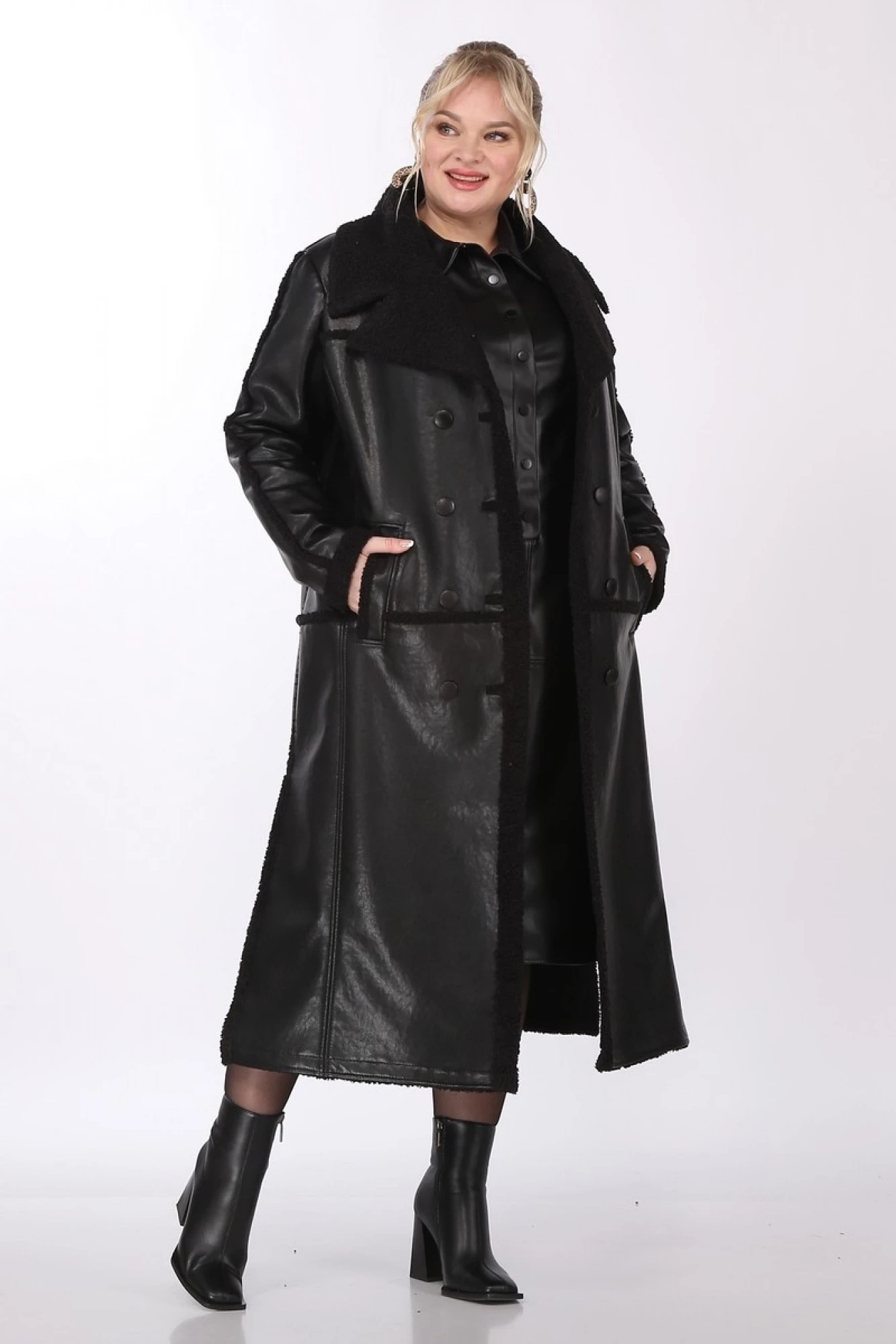Изделие выполнено из высококачественной мягкой экокожи, которая не трескается и не растягивается, в отличие от натуральной кожи. Все молнии на изделии металлические. Пальто без подкладки и утеплителя.