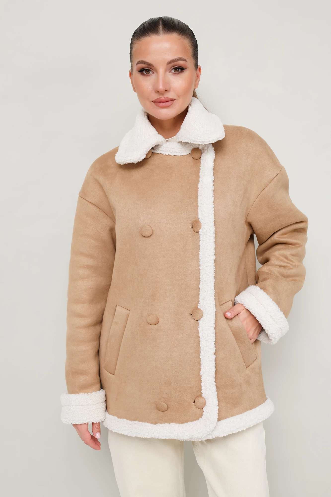 Дубленка декорирована искусственным мехом, который придает образу благородную мягкость и уют."