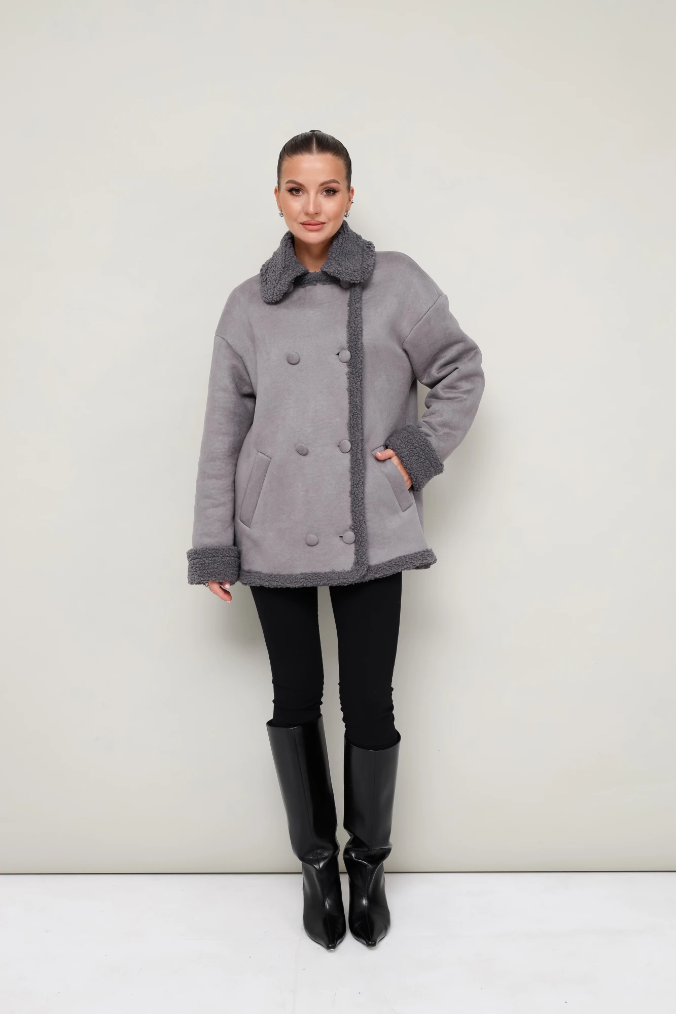 Дубленка декорирована искусственным мехом, который придает образу благородную мягкость и уют."