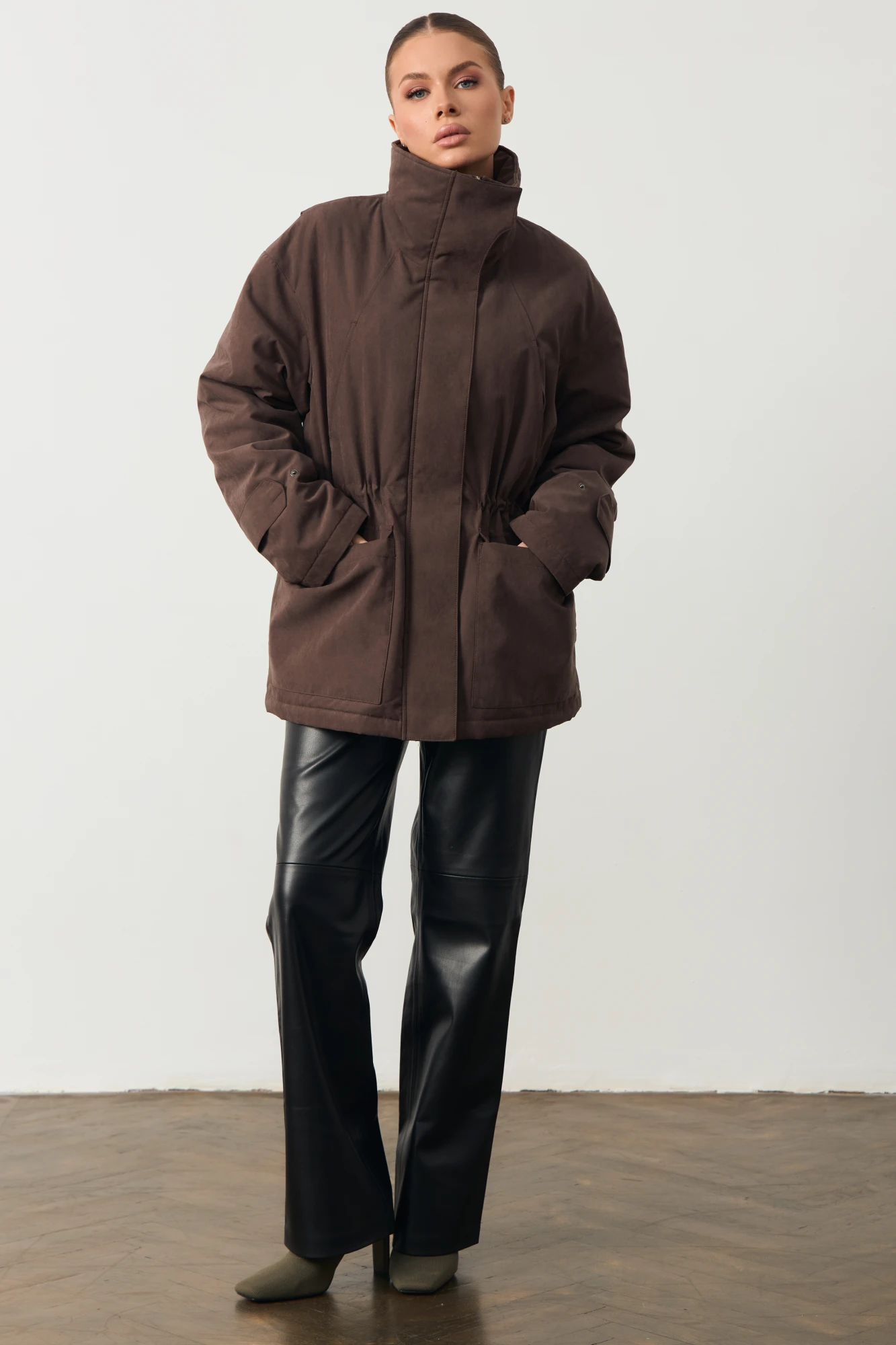 Женская куртка с высоким воротом. На поясе кулиска. Изделие прямого кроя. Состав товара: Полиэстер 100%, Подкладка: Вискоза 53% Полиэстер 47%. Длина изделия 74см; Длина рукава 75см.