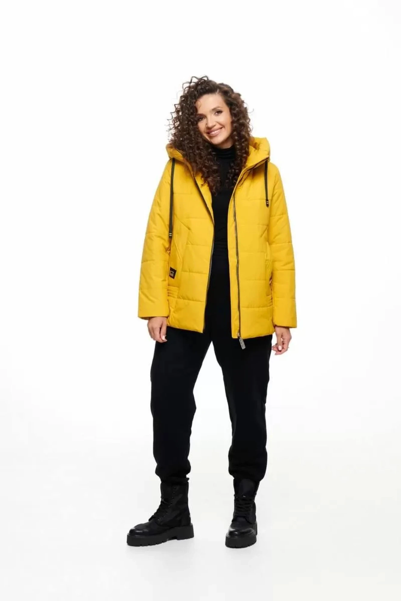 Капюшон притачной по линии горловины. По периметру капюшона протянут эластичный шнур, с декоративными наконечниками.