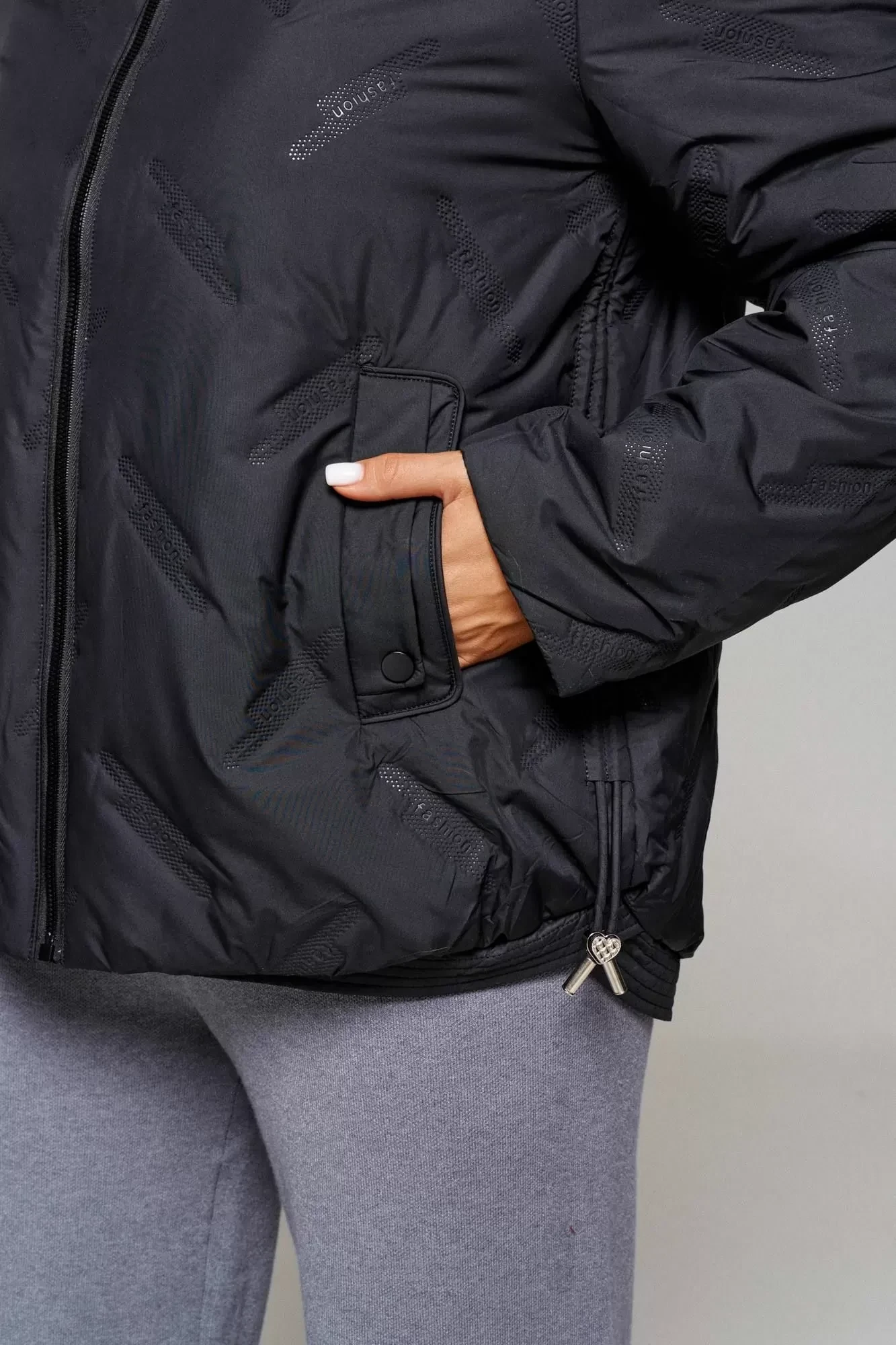 Застежка центральная на декоративную молнию с ветрозащитной планкой внутри. Длина молнии от верхней части капюшона до нижнего края изделия.