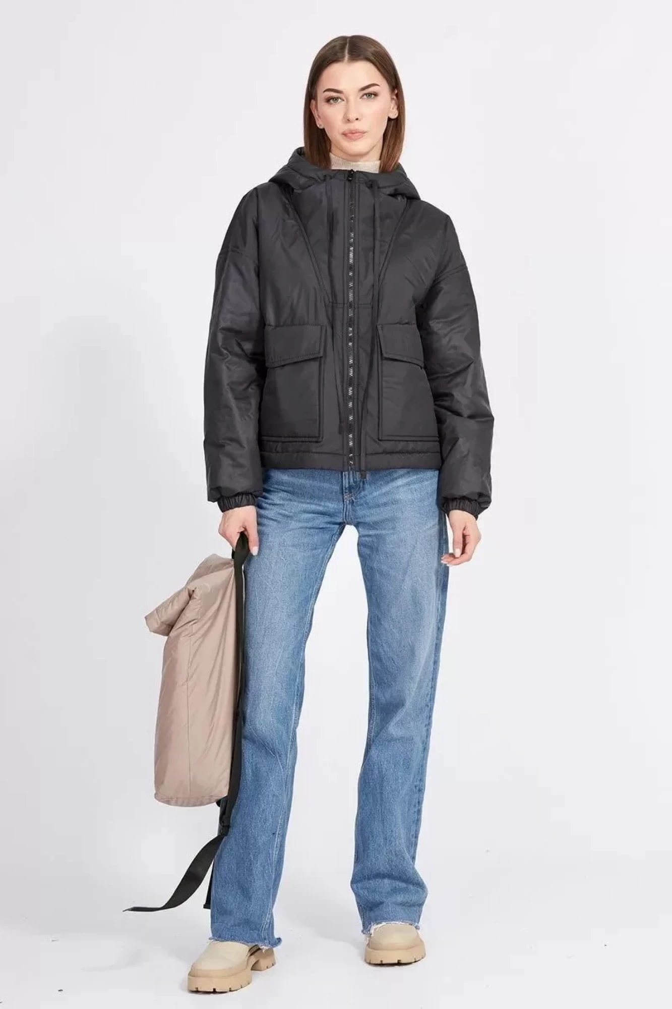 44,46,48,50,52, 54Длина куртки по спинке: р.44-48 - 58 см, р.50-54 - 63 см. Длина рукава - 53 см.