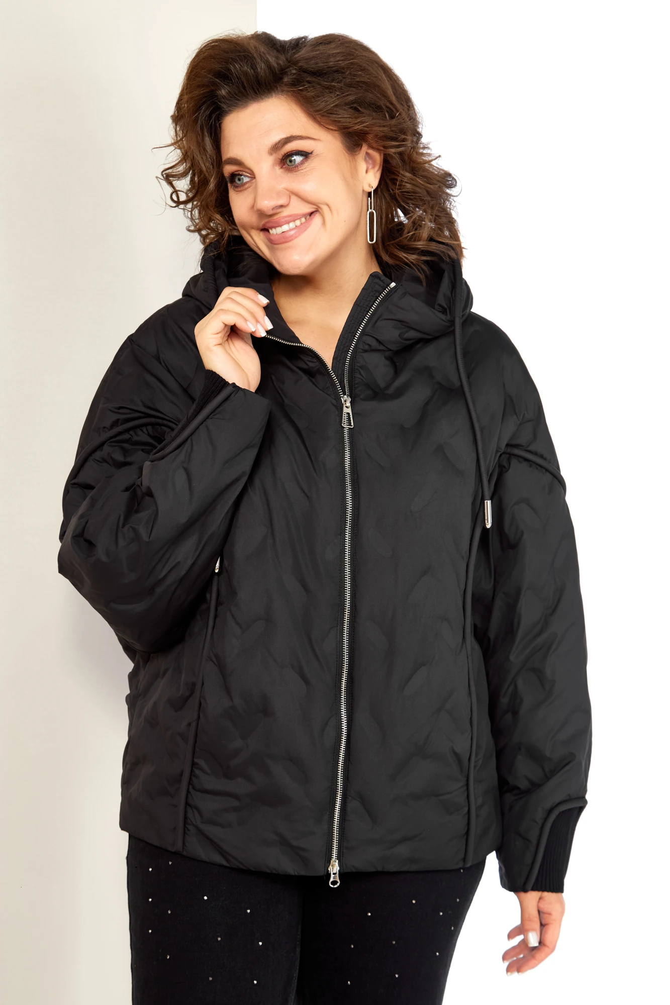 Застежка центральная на молнии. Рукав реглан. В передней части кант плавно переходящий на рукав, в котором расположены прорезные карманы на кнопках. Низ рукавов с трикотажной вставкой в тон основной ткани. Капюшон не съемный, регулируется декоративным шнуром. Спинка цельнокроеная, по низу две вытачки, для более плотного прилегания к фигуре. С внутренней стороны куртки имеется внутренний карман. Низ с фигурной линией, что придает изделию оригинальный вид. А также регулируемая кулиса. За счет свободного кроя изделие подойдет на любую комплектацию и фигуру.