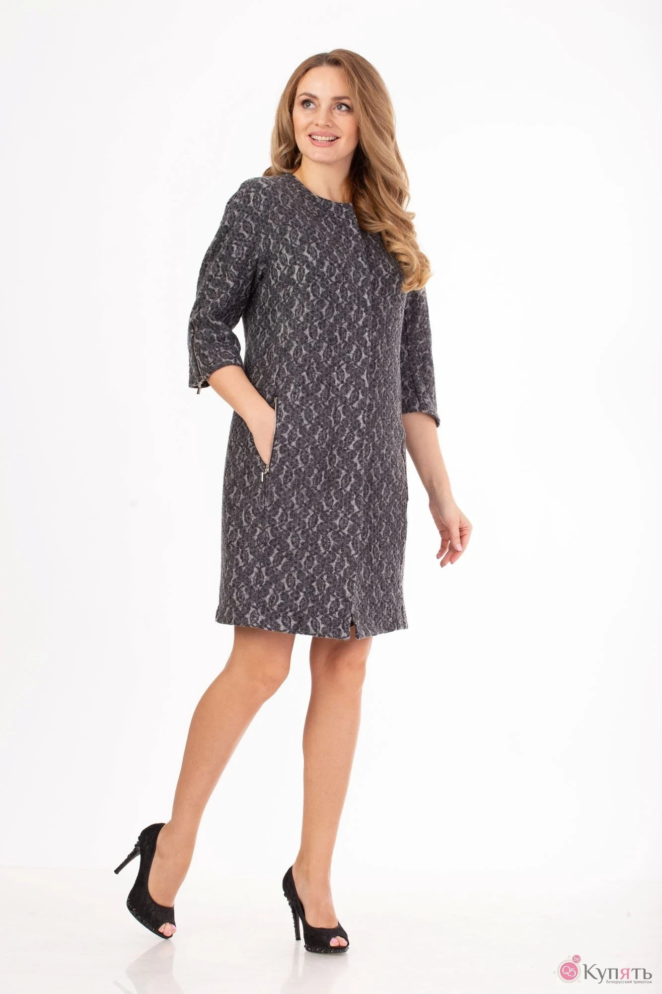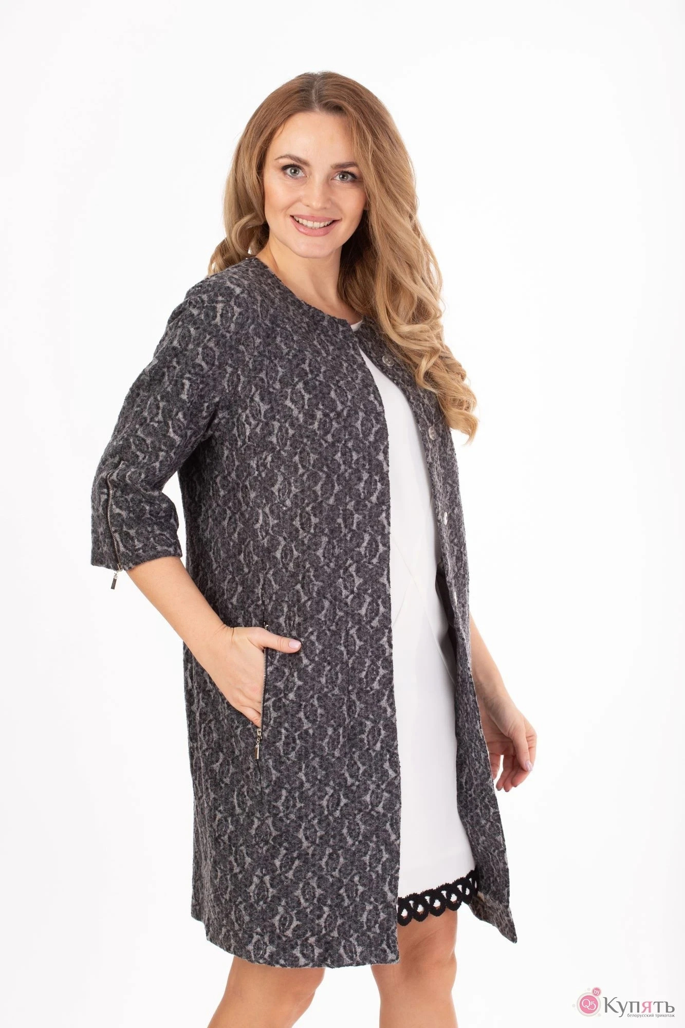 и цельнокроеный 3/4 рукав с подрезом в стиле 60-х, отрезные боковые детали, выполнено из трикотажного полотна, в состав которого входит шерсть. В швах притачивания боковых деталей по переду действующие карманы, застегивающиеся на молнию. Супатная застежка на пуговицы. В верхнем шве рукава снизу молния. Правильная длина - до середины колена.
