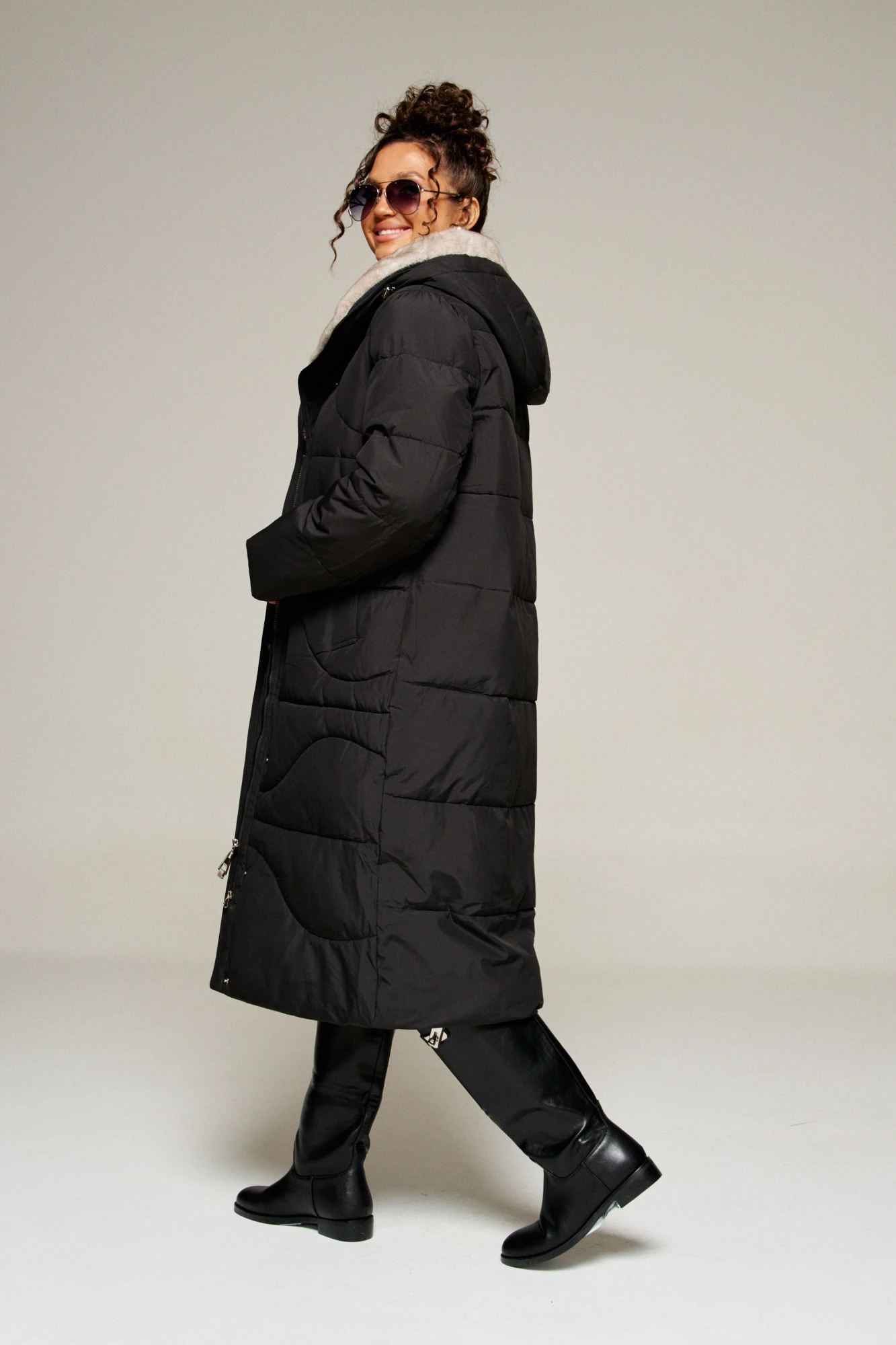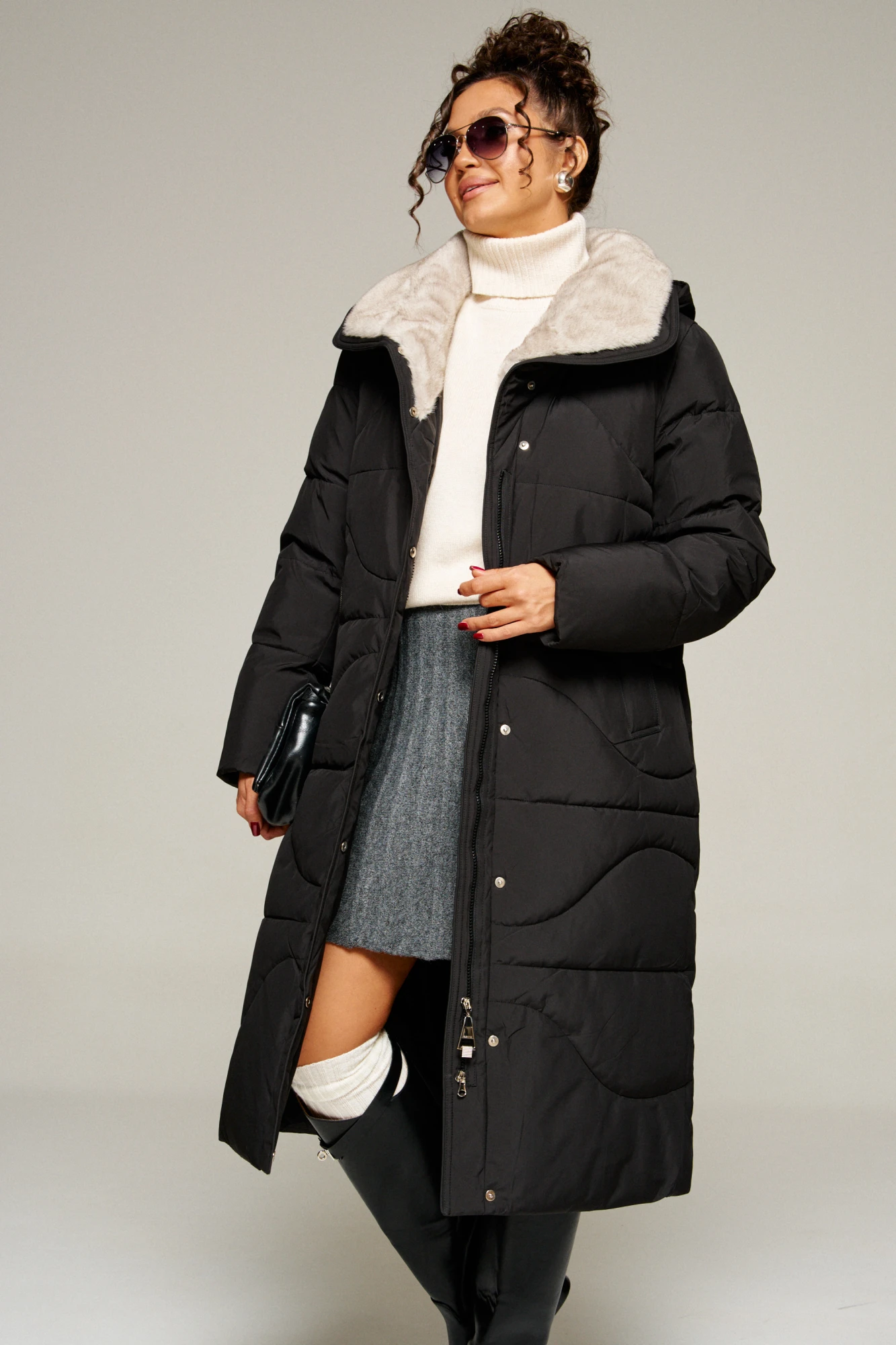 Воротник тип «апаш» с возможностью застегивания до верха. Внутренняя часть воротника обработана искусственным мехом «норка».