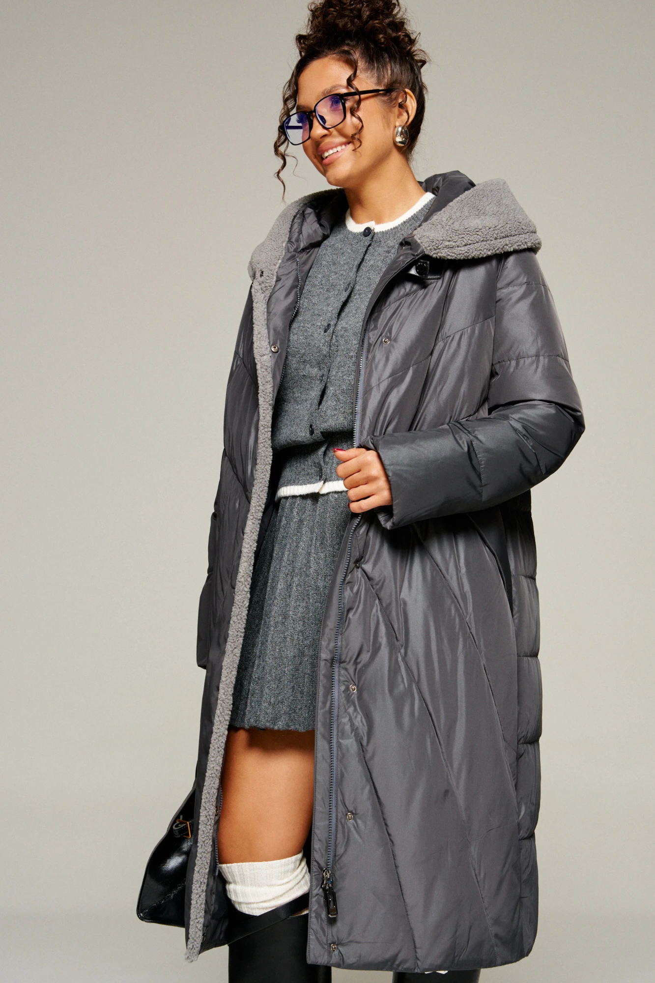 Застежка центральная на двустороннюю молнию от верха до низа и кнопки. Под капюшоном спереди настрочен дополнительный элемент застежки из экокожи.