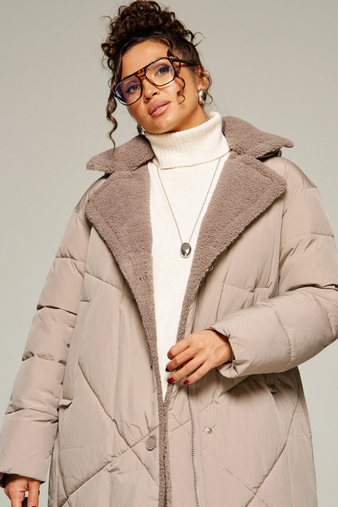 Воротник пиджачного типа с возможностью застегивания до верха. Внутренняя часть воротника, борта и лацканы обработаны искусственным мехом «овчина».