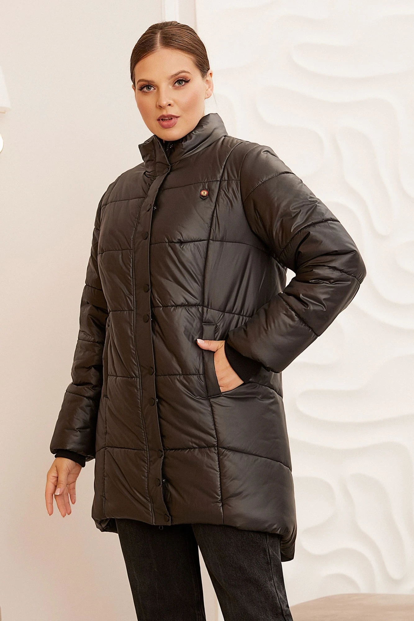 - ISOSOFT гипоаллергенный материал (не вызывает аллергию), легко стирается и быстро сохнетКуртка на стойке с застежкой на металлическую молнию (с двумя бегунками), молния закрыта вертикальной планкой с металлическими кнопками. Перед с вертикальными рельефами, в рельефах выполнены карманы с листочками. Спинка чуть длиннее переда, с кокеткой и средним швом, по центру кокетки пришито декоративное украшение. Рукава втачные, свободные (внутри на притачной манжете из вязанного трикотажа).