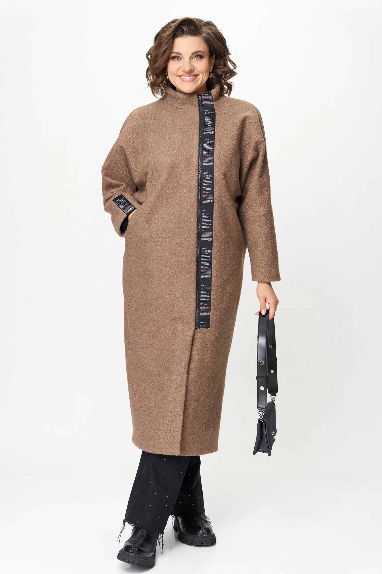 Свободный силуэт с приспущенной линией плеча обеспечивает удобство и свободу движений. Высокий воротник-стойка защищает от ветра, а асимметричная декоративная планка с фирменной нашивкой добавляет современный акцент. Длина миди визуально вытягивает силуэт, делая образ стройнее. Лёгкая конструкция без подкладки позволяет носить пальто каждый день — от офисных образов до прогулок и стильных многослойных комплектов.