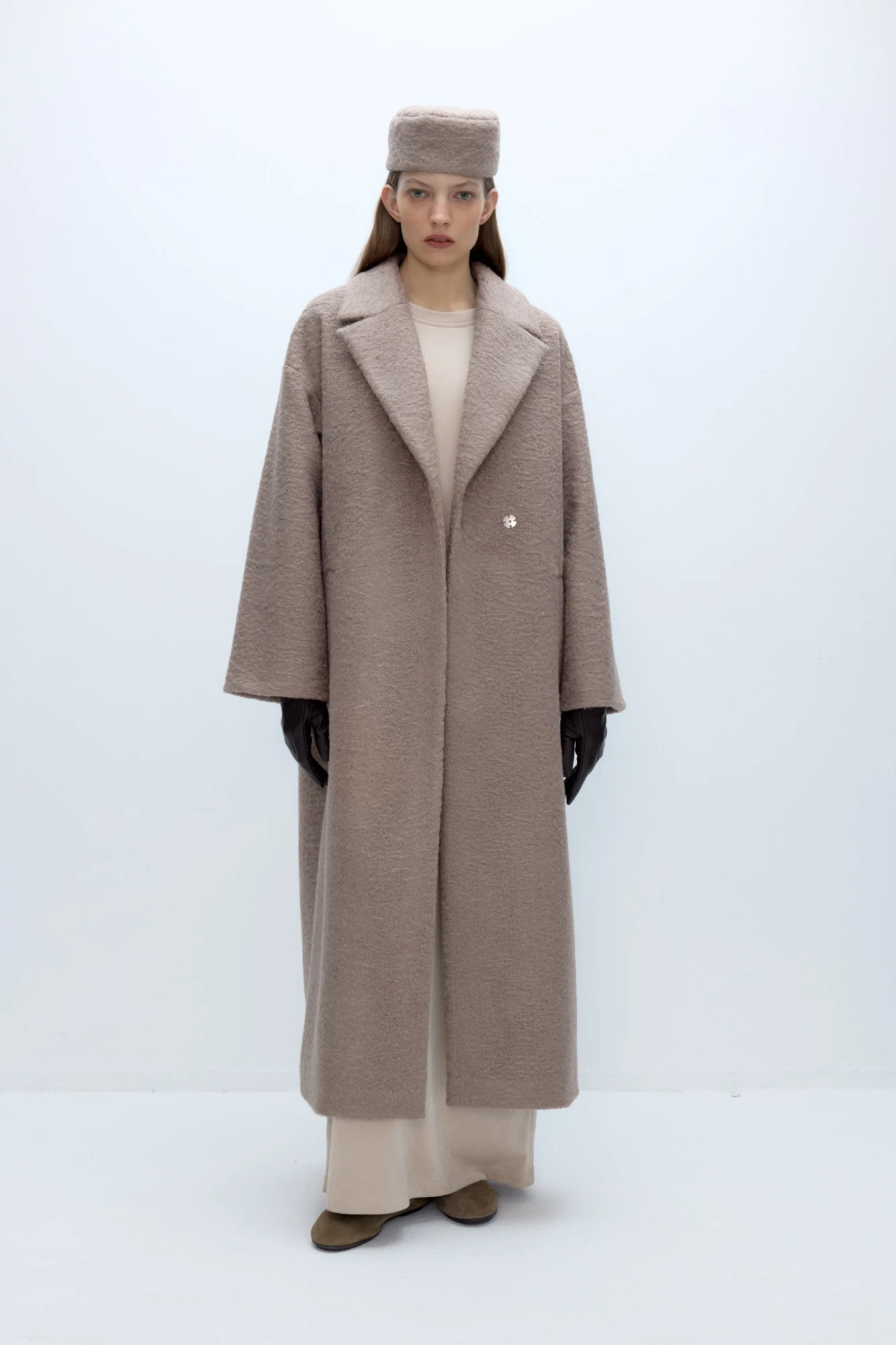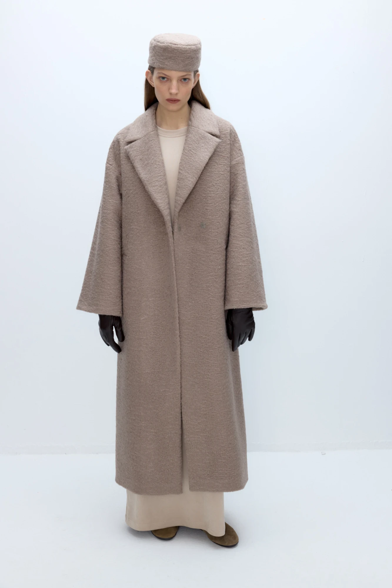 Детали: прямой силуэт, спущенная линия плеча, перед с прорезными карманами, пиджачный воротник, двубортная застежка на пришивные кнопки, рукава длинные, съемный пояс со шлевками, пальто на подкладке.