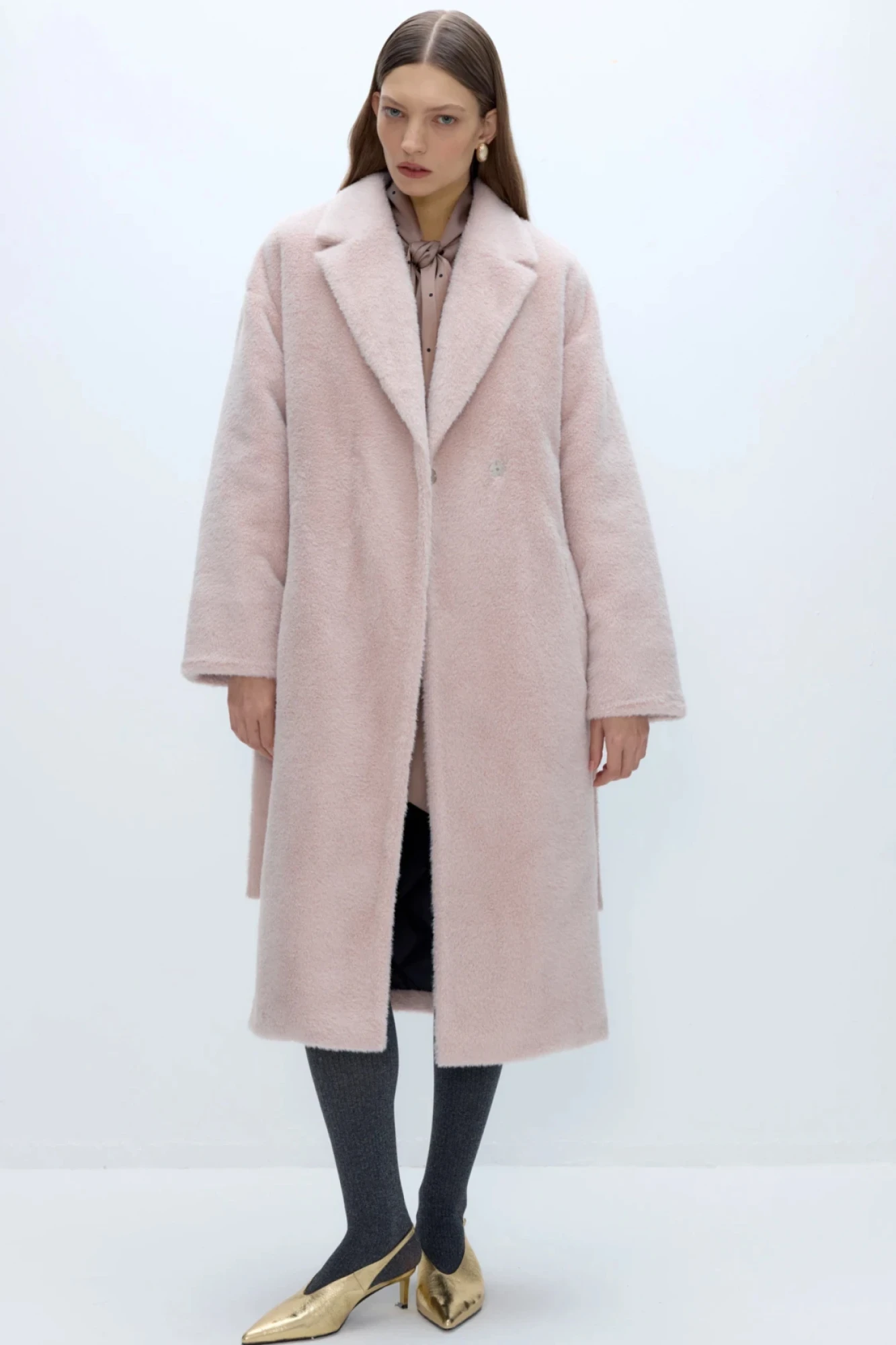 Детали: прямой силуэт, свободный покрой, спущенная линия плеча, перед с прорезными карманами, пиджачный воротник, двубортная застежка на пришивные кнопки, рукава длинные, съемный пояс со шлевками, пальто на утепленной подкладке.