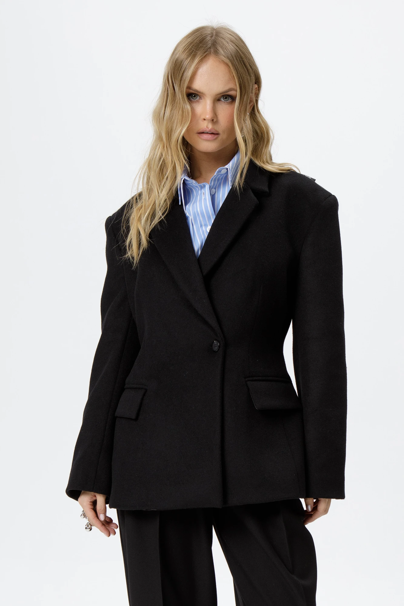 Детали: полуприлегающий силуэт, расширенные плечи, пиджачный воротник, талиевые вытачки переда и спинки, застежка на петли и пуговицы, функциональные карманы, на подкладке.