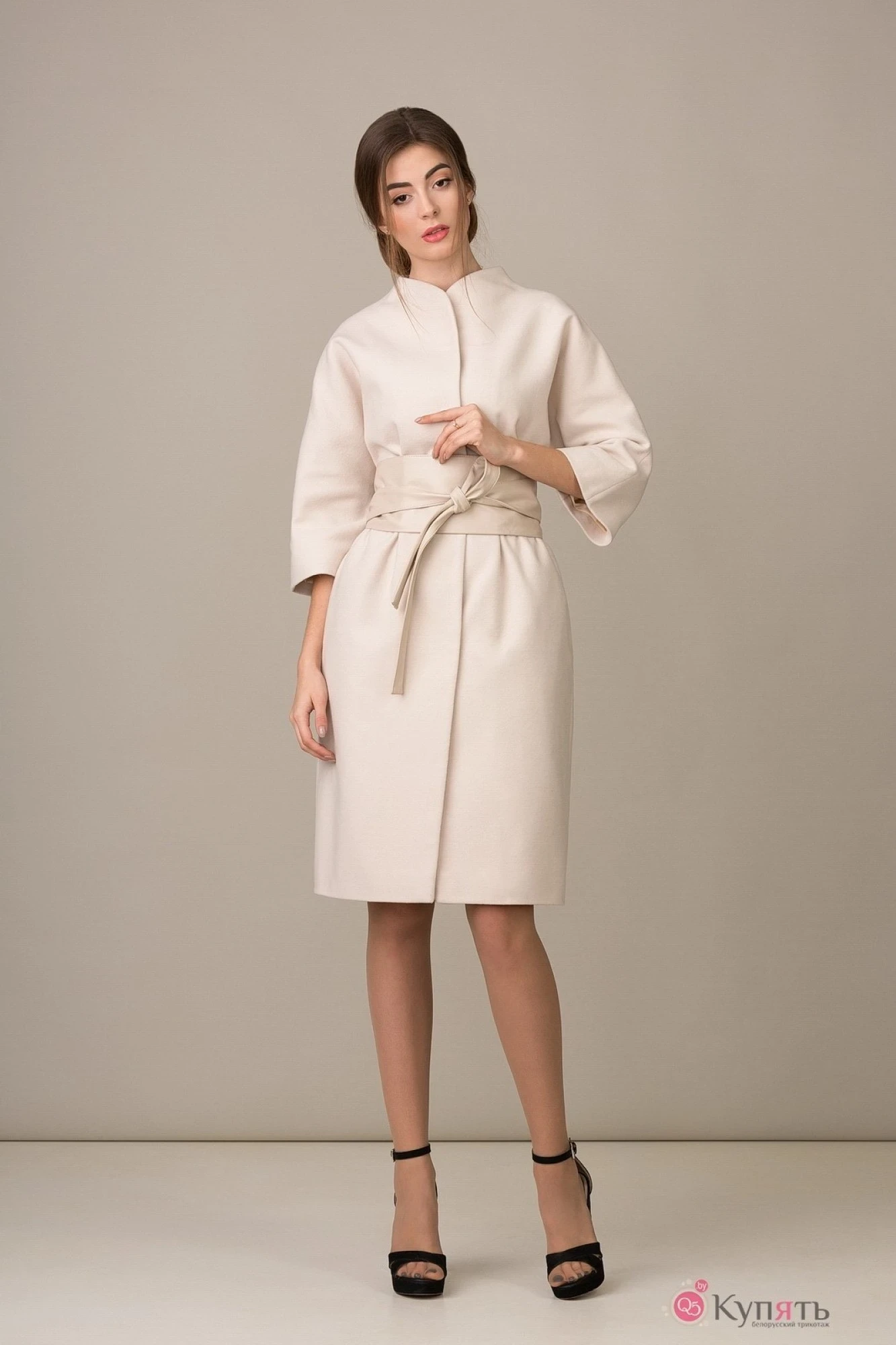 Пальто из мягкой пальтовой ткани на подкладке. Современный силуэт «летучая мышь», мягкость и нежность ткани цвета топленого молока придают пальто особую элегантность. Воротник - цельнокроеная стойка, рукава - трехчетвертные. В боковых швах - внутренние карманы. Пальто застегивается на пришивные кнопки. Фигурный пояс из кожи подчеркнет достоинства фигуры и добавит шарма.