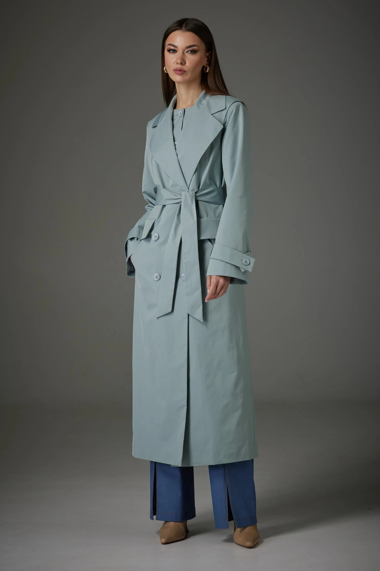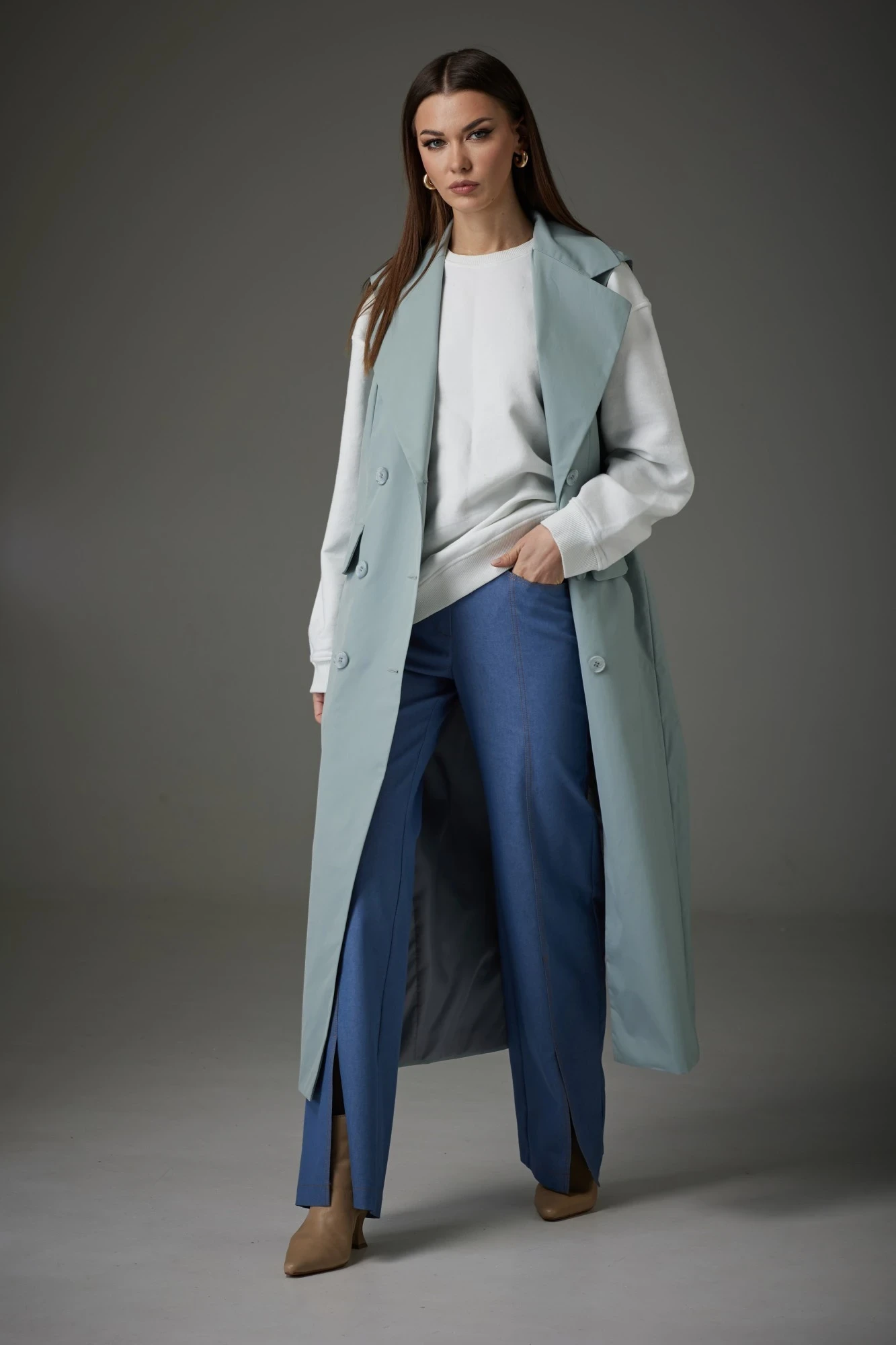 Жилет удлиненный до середины икры, застежка двубортная на петли-пуговицы. Горловина оформлена воротником пиджачного типа. На спинке расположен средний шов со шлицей.