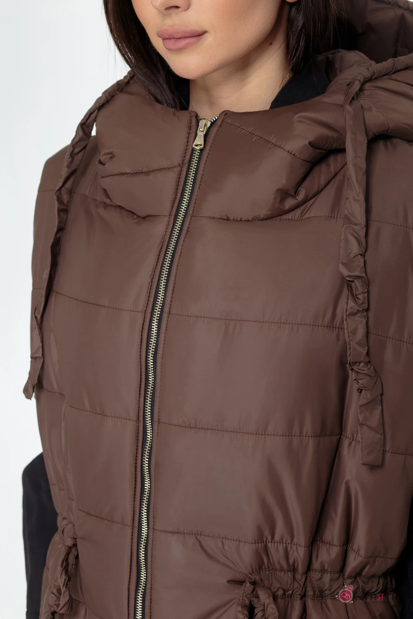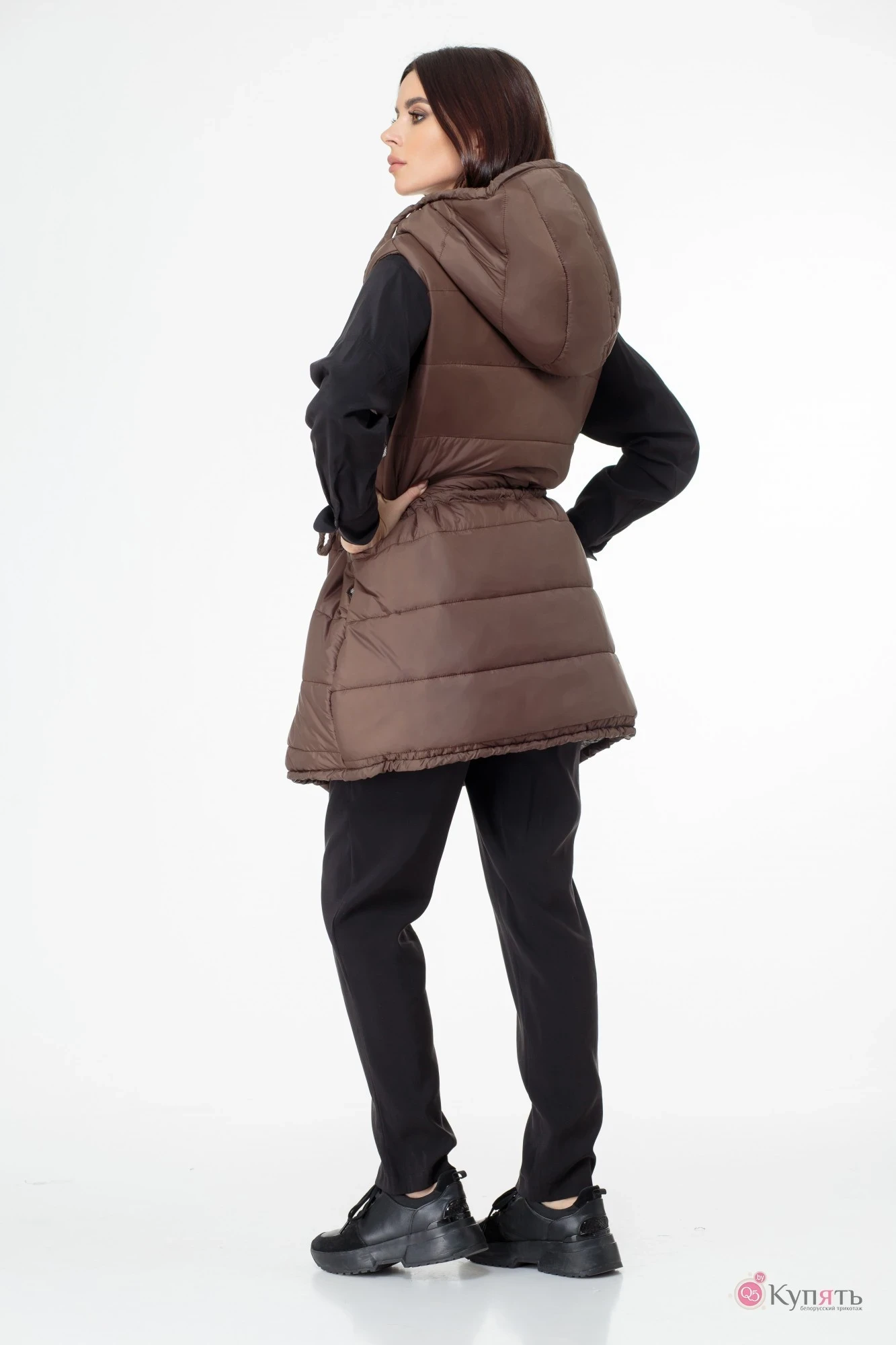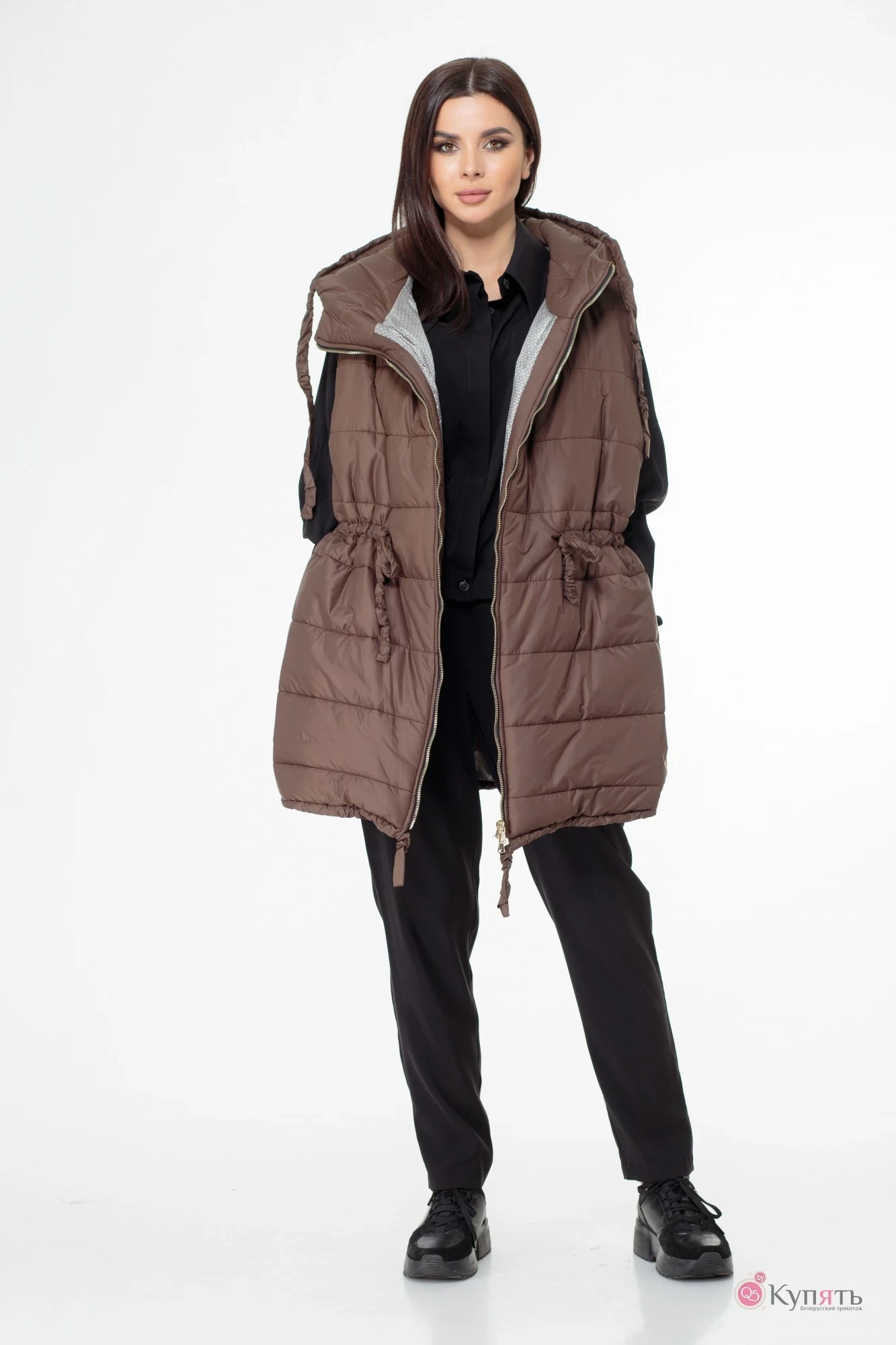 58, 60 , 62Прямой силуэт с завышенными прибавками по обхватам для удобной носки и комбинирования жилета с верхней одеждой.Объёмный капюшон,застёжка на разъемную молнию по всей длине.В области талии,по низу и в капюшоне шнурки,обтянутые тканью верха для фиксирования обхватов по вашему желанию.