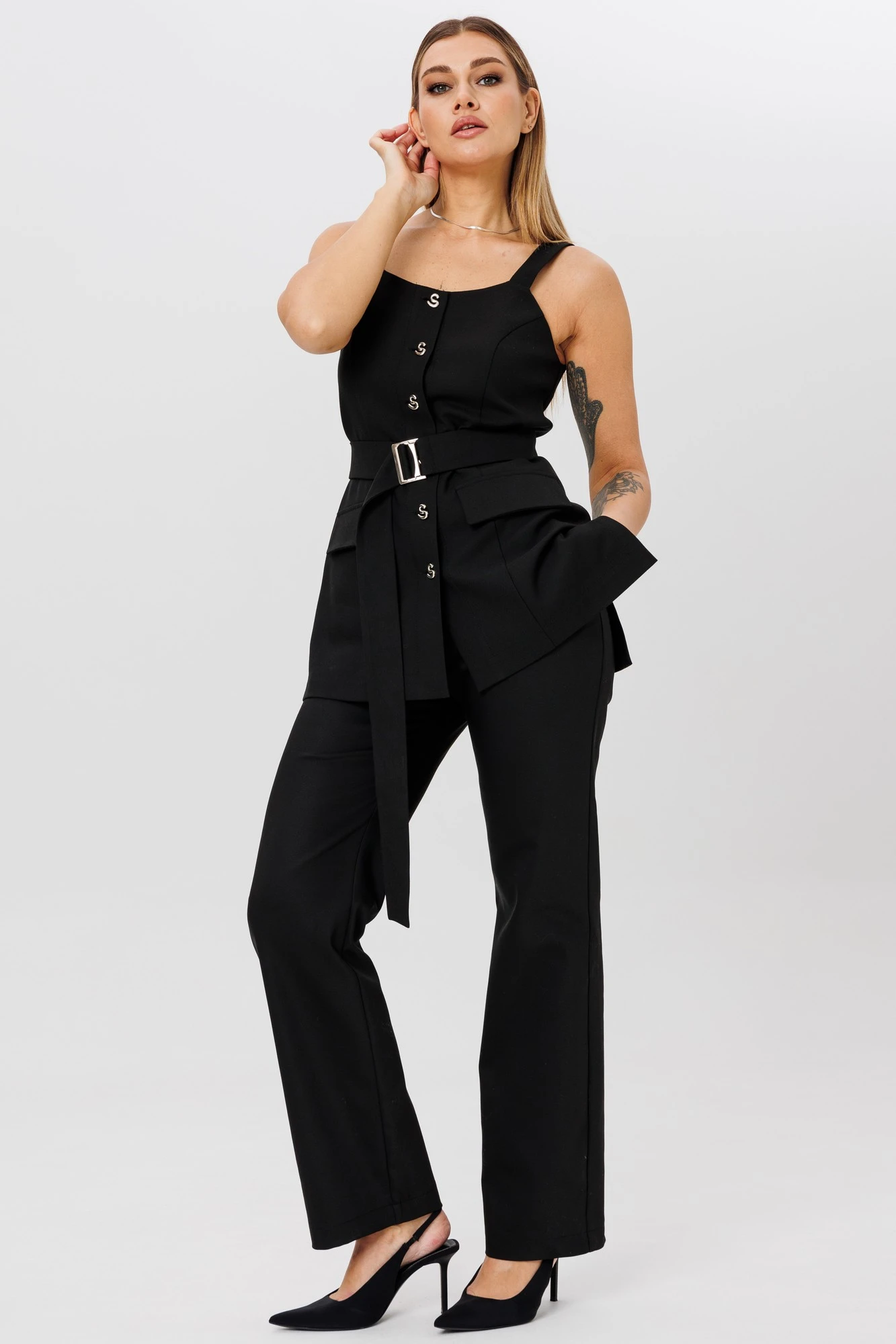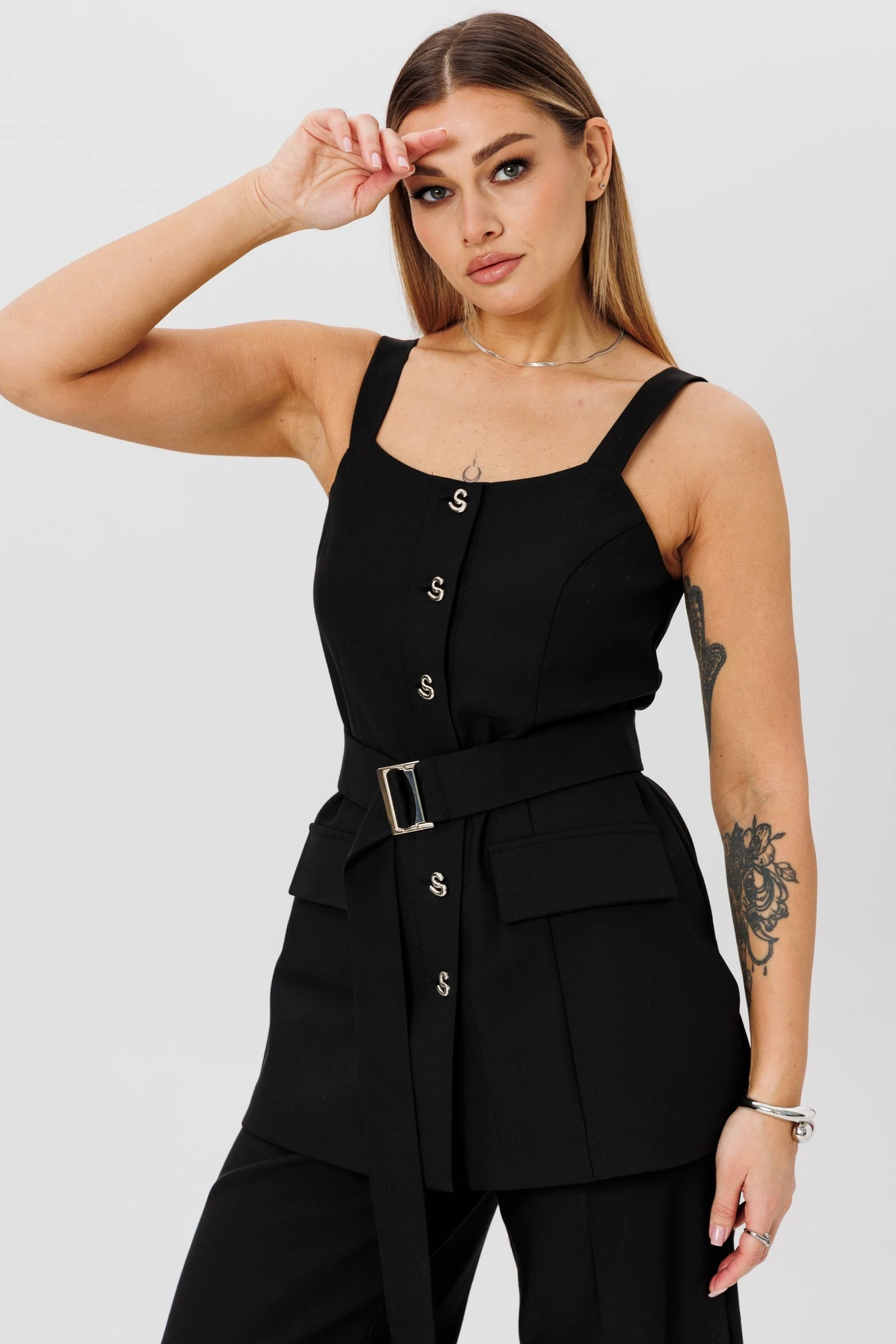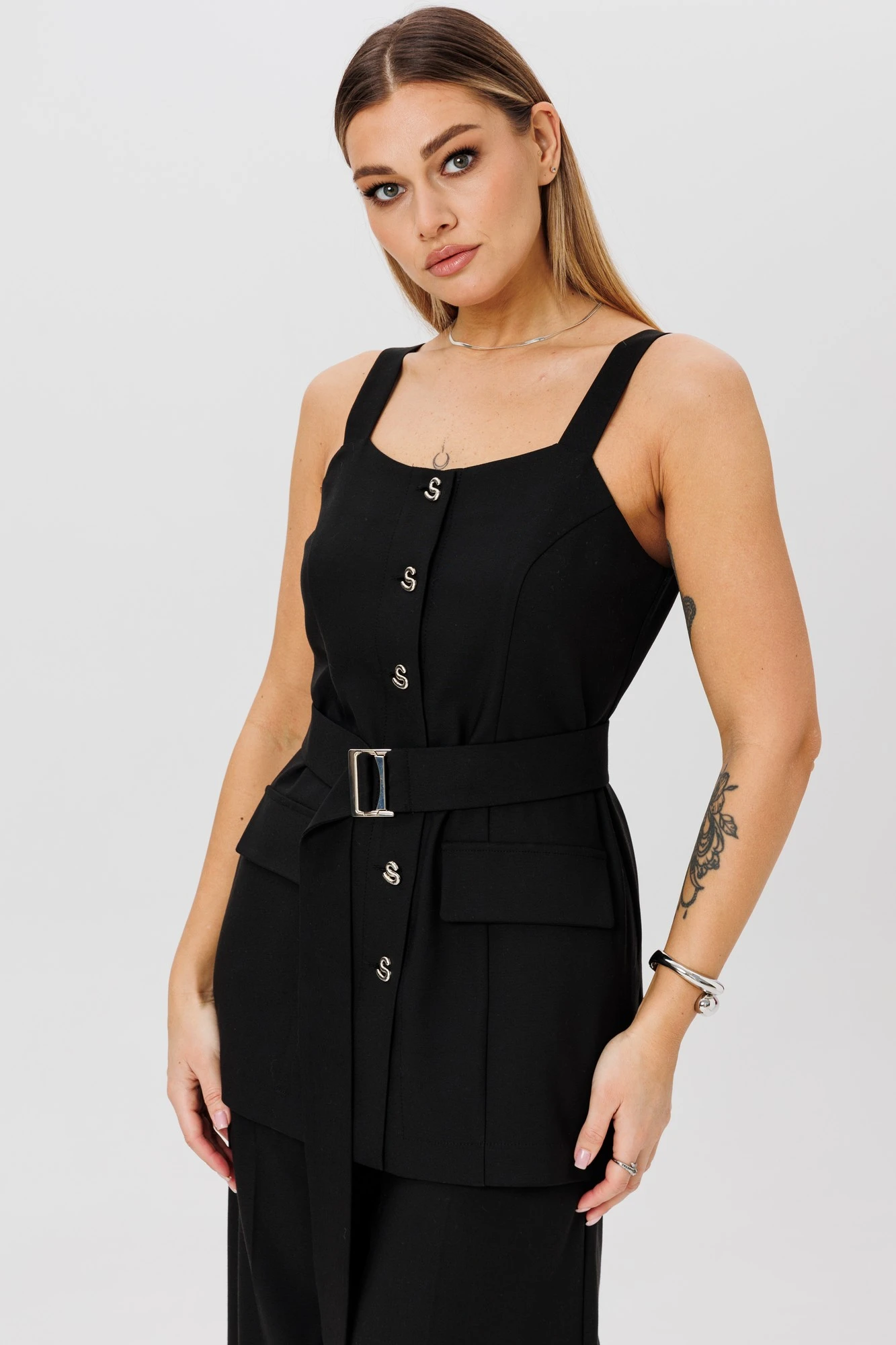 Жилет на бретелях. Перед с центральной застежкой на петли и пуговицы, рельефами и настрочными клапанами. Спинка со средним швом и талиевыми вытачками. В боковых швах разрезы.