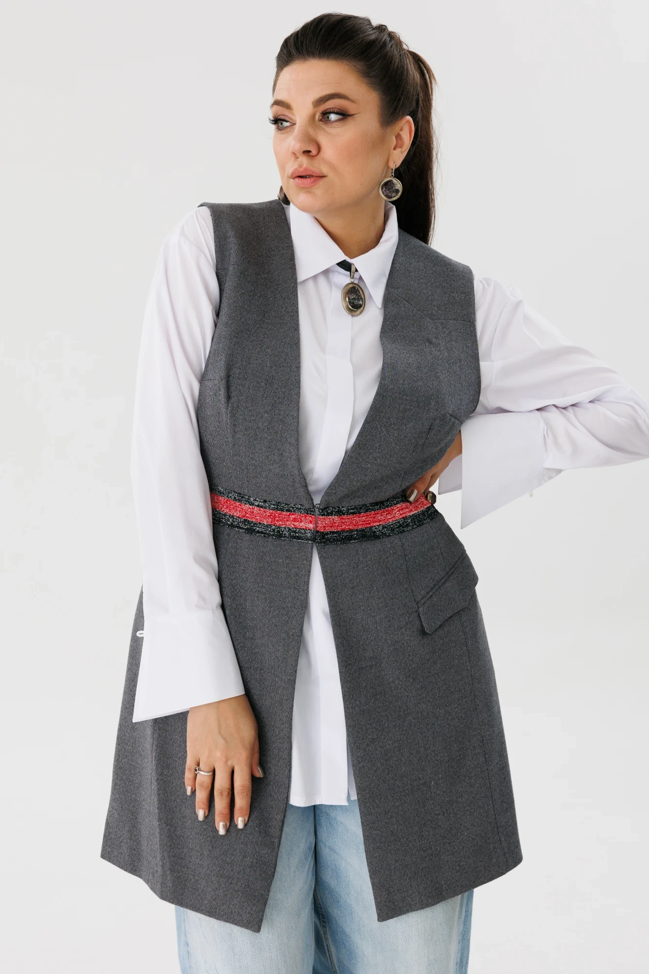 Полуприлегающий силуэт,низкий v-образный вырез горловины удлиняет силуэт.По переду функциональные карманы с фигурным клапаном.