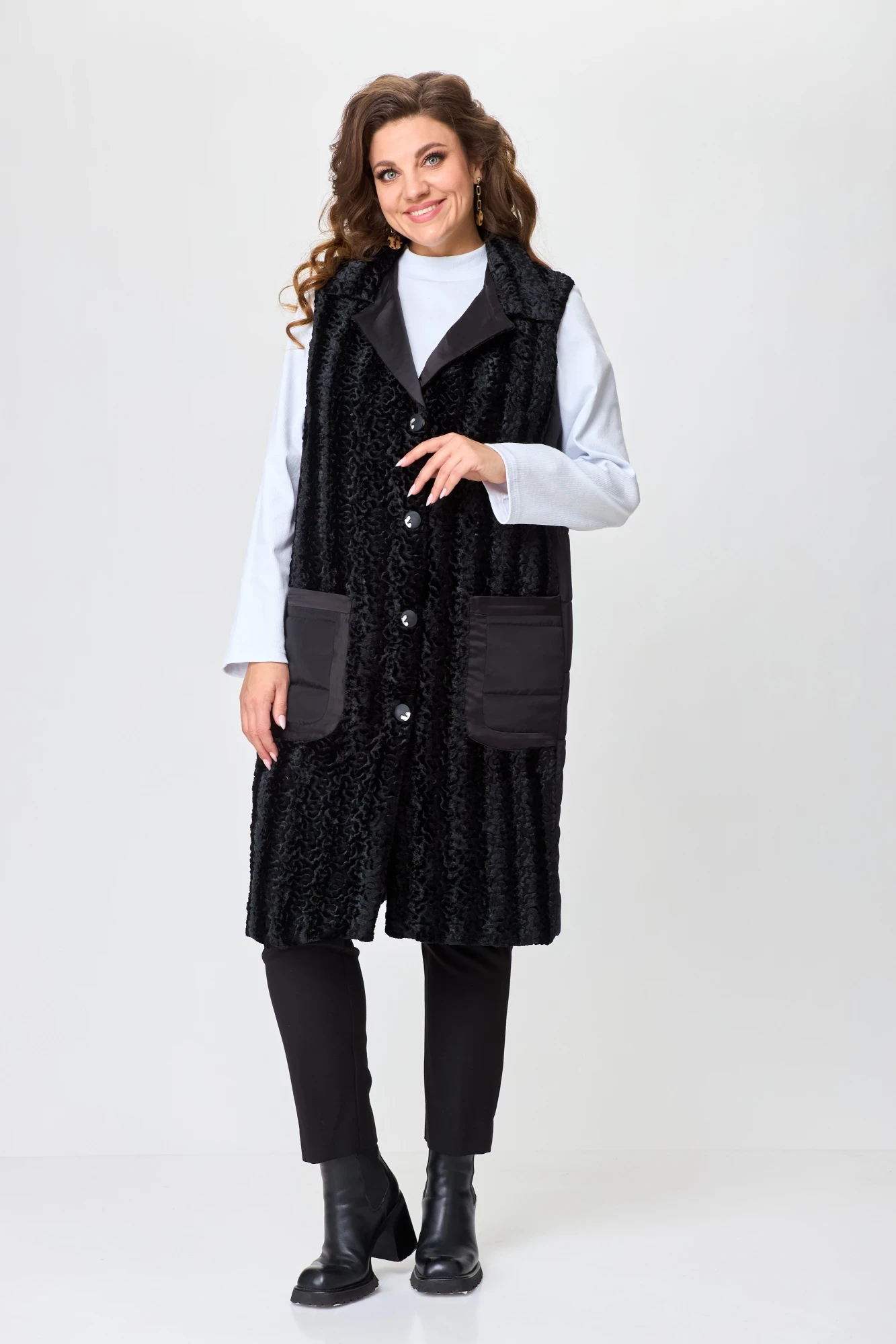 Стильный комплект состоящий из мехового жилета из комбинированной утепленной ткани и трикотажного гольфа. Меховой жилет прямого силуэта из стеганой ткани по бокам. По переду рельефы и накладные карманы. Застежка пуговицы. Спинка прямая с центральным швом. По полочке нагрудные вытачки. Жилет на подкладке.