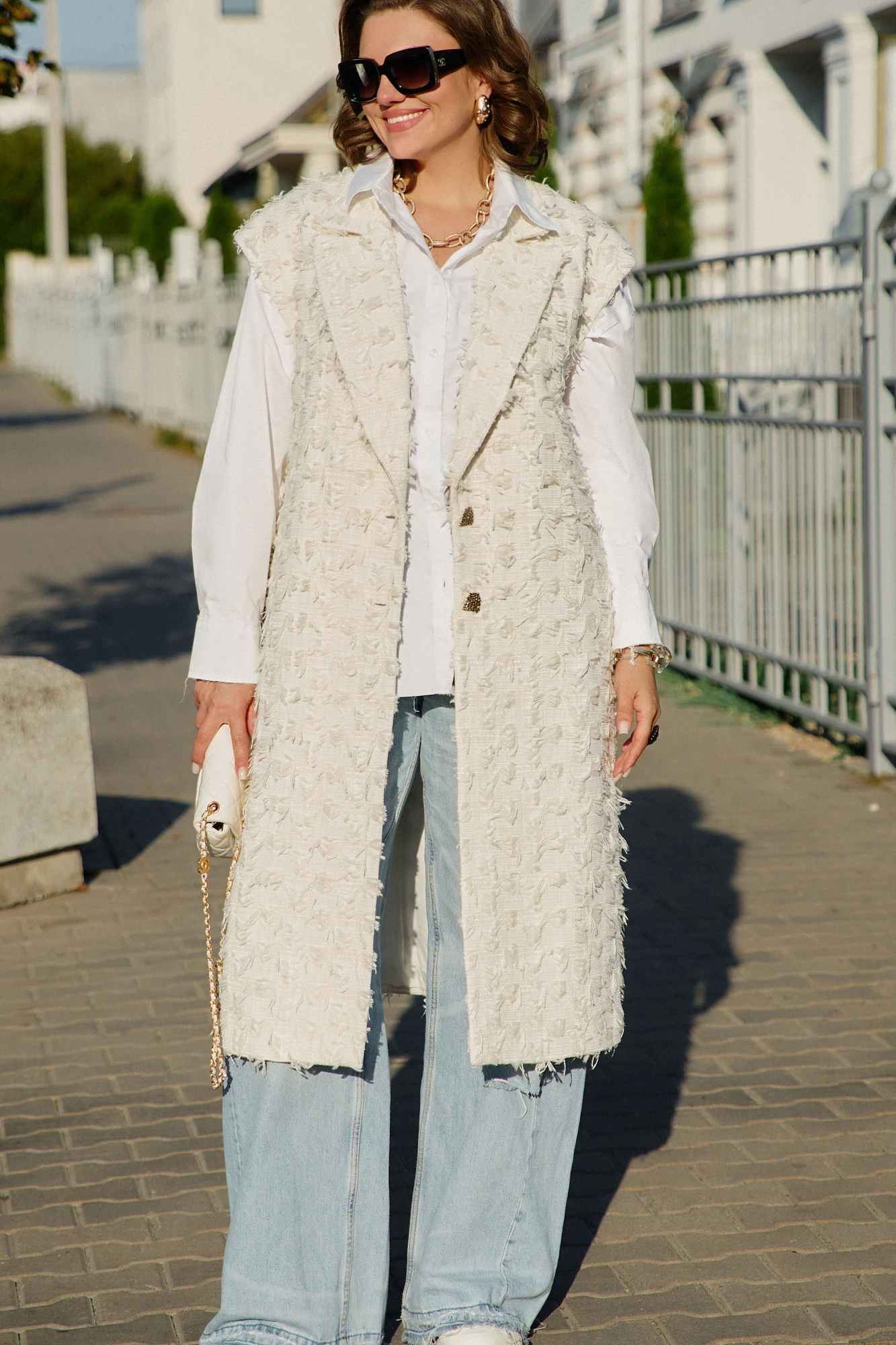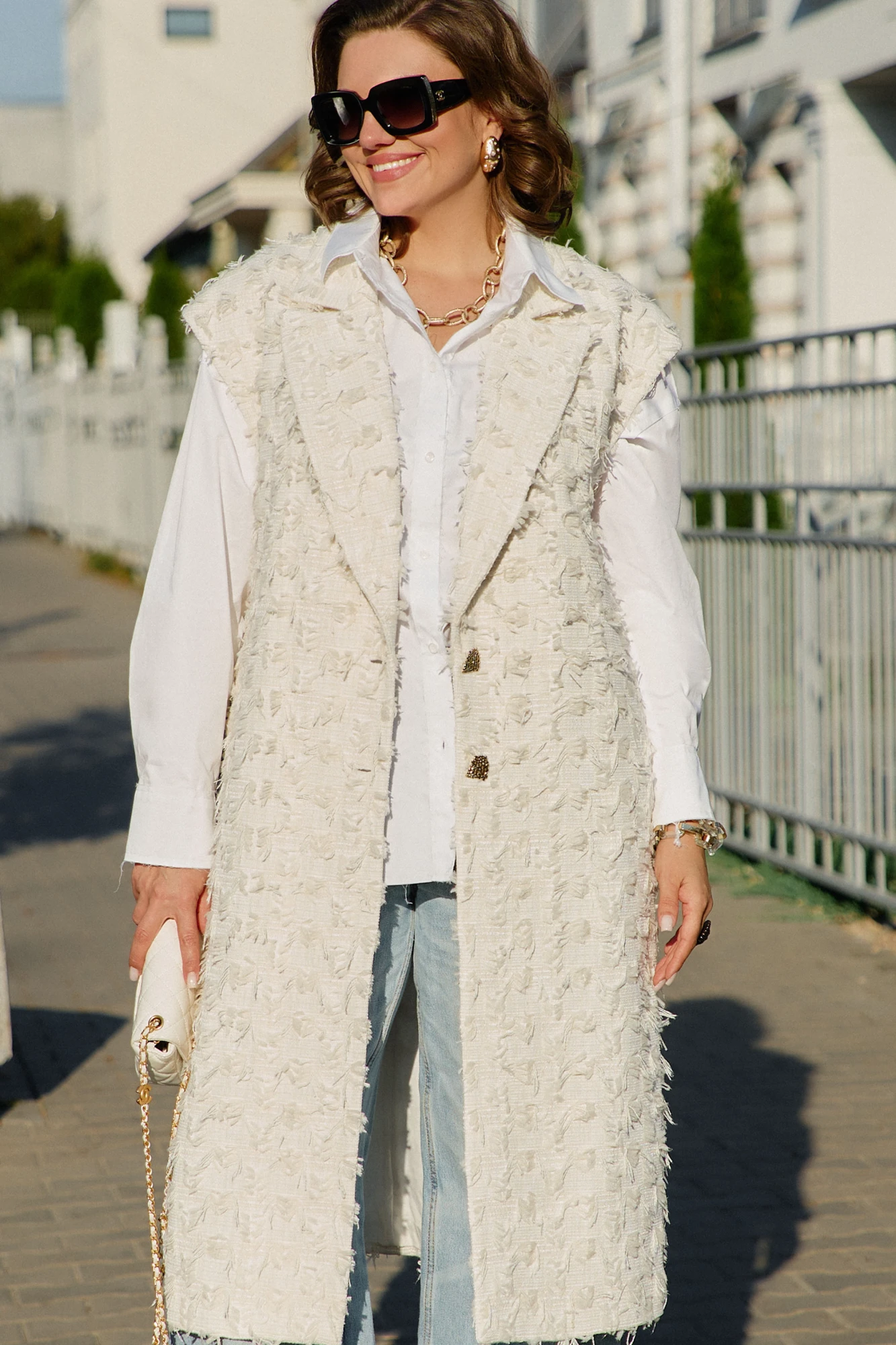 Длина жилета вдоль середины спинки от шва втачивания воротника 117 см (р.50-54), 119 см (р.56-60). Ширина плеча 21 см (р.50-54), 22 см (р.56-60).