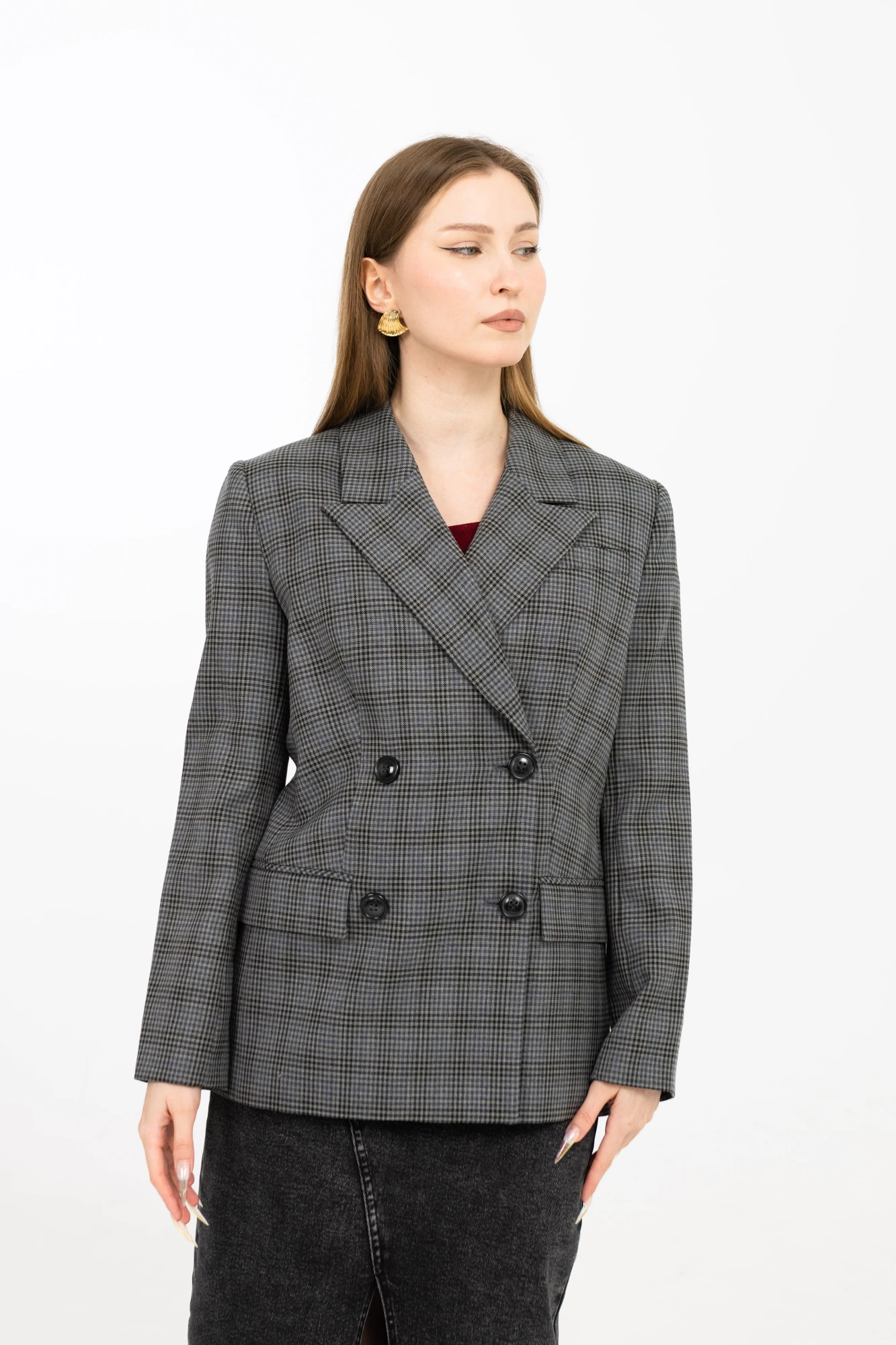 Жакет прямого свободного силуэта , длиной 81 см, с двубортной застёжкой на петли -пуговицы.