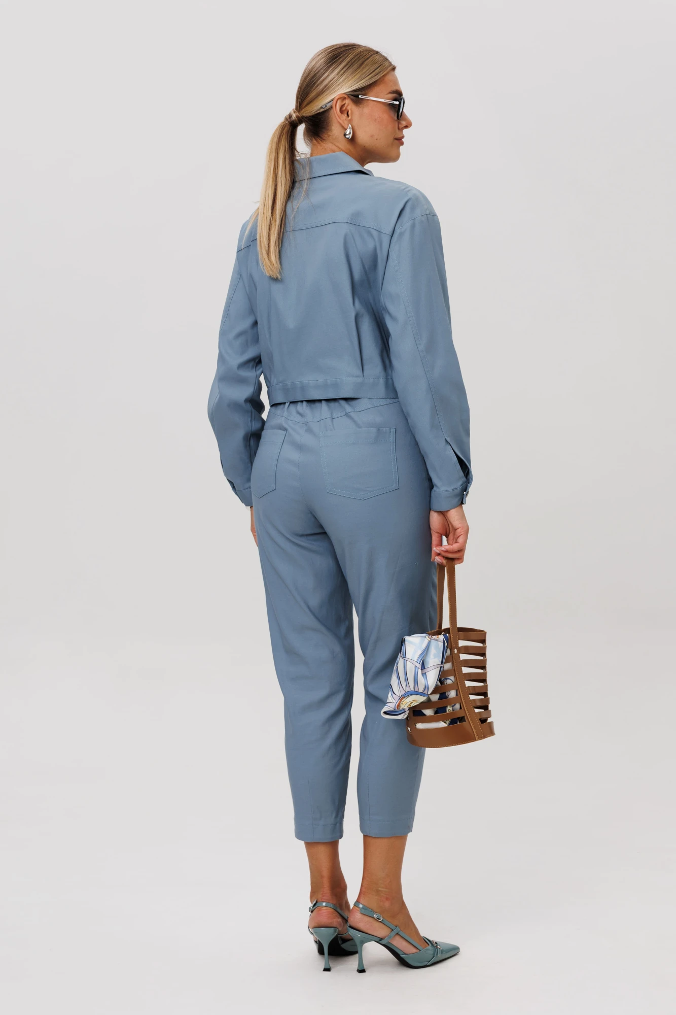 Жакет укороченный, прямого кроя. Переднюю часть украшают нагрудные карманы с декоративными клапанами. Застёжка на петли и кнопки добавляет модели характер, а спинку завершает изящная кокетка. Длинные рукава заканчиваются манжетами, а горловина обработана аккуратным воротником.