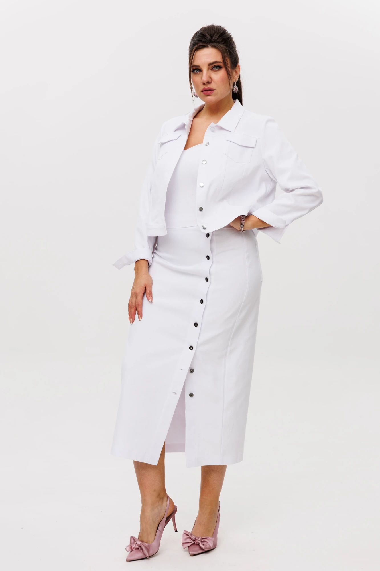 50, 52 , 54 , 56 , 58 , 60 , 62Он сочетаем с брюками, юбкой. Его носят поверх платья. Наш блузон имеет прямой силуэт, выполнен из актуального джинса. По переду кокетка и красивые конструкторские линии, функциональные карманы. Отложной воротник, застежка на металлические пуговицы-кнопки. Спинка с кокеткой. Втачные рукава с притачными манжетами на застёжке. По нижней планке и верхнему карману настрочена отделочная лента. Швы подчёркнуты отделочными строчками. Идеален для каждого летнего дня