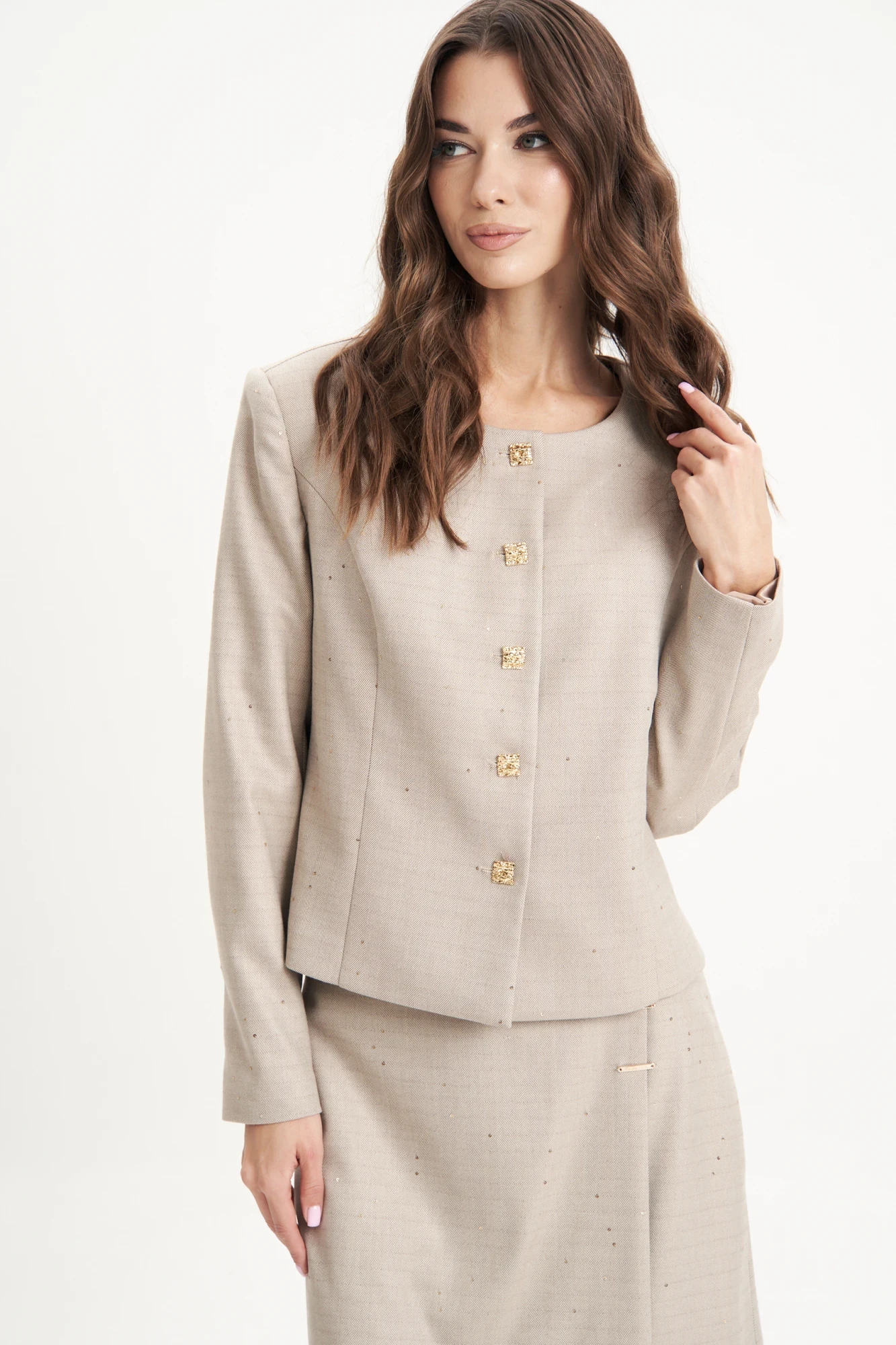 Жакет из необычного по текстуре материала с вкраплением пайетки, брюки из полотна без пайетки. Полуприлегающий силуэт пиджака с центральной застёжкой, круглым вырезом горловины и втачным покроем. Полочка с фигурным рельефом, спинка с фигурным рельефом, центральным швом и плечевыми вытачками. Рукав двухшовный.