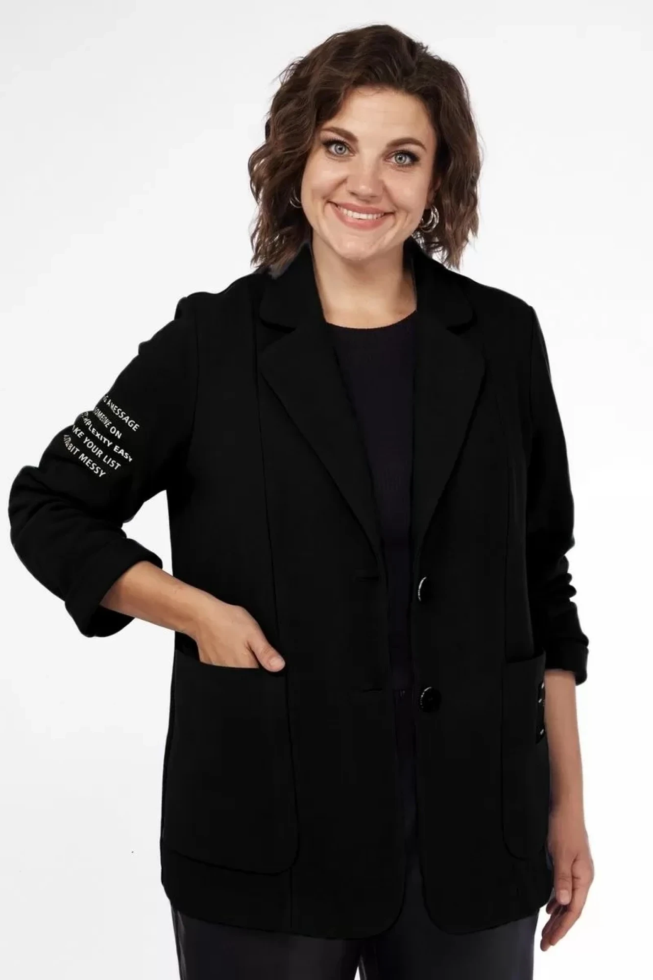 Длина жакета по спинке – 71 см, рукава — 62 см.