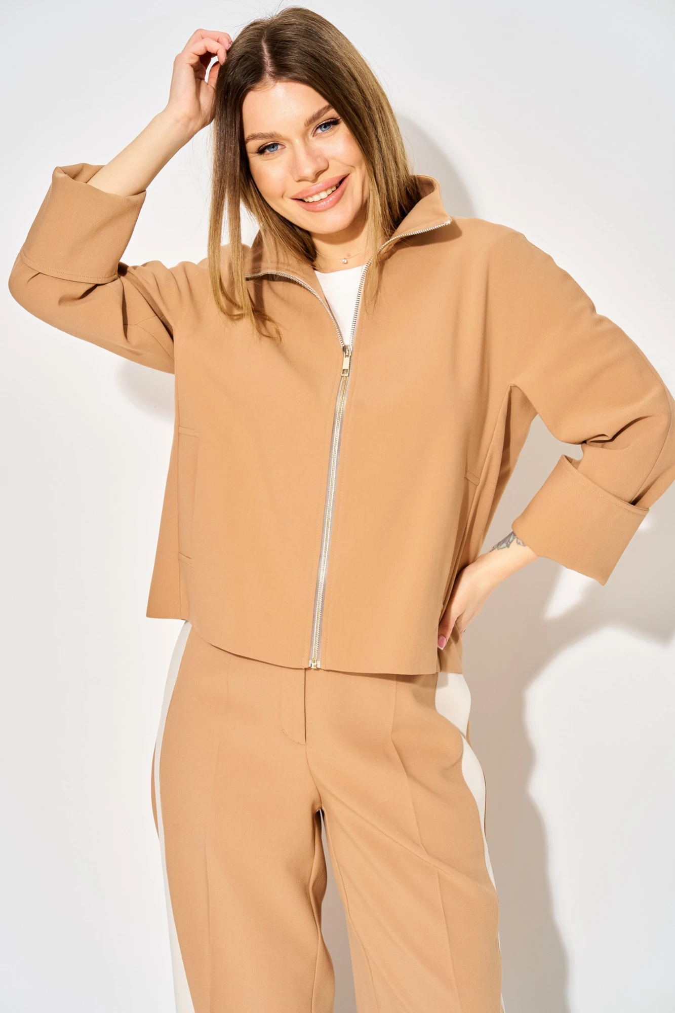 Застежка центральная на металлическую тесьму-молнию. Вырез горловины «под горло», с втачной стойкой. Детали переда с отрезными бочками, в швах обработаны карманы. Спинка жакета со средним швом. Рукава цельнокроеные длиной 3/4, низ обработан обтачкой. Рукава с незакрепленным отворотом, который, при необходимости, можно отвернуть. Жакет на подкладке.