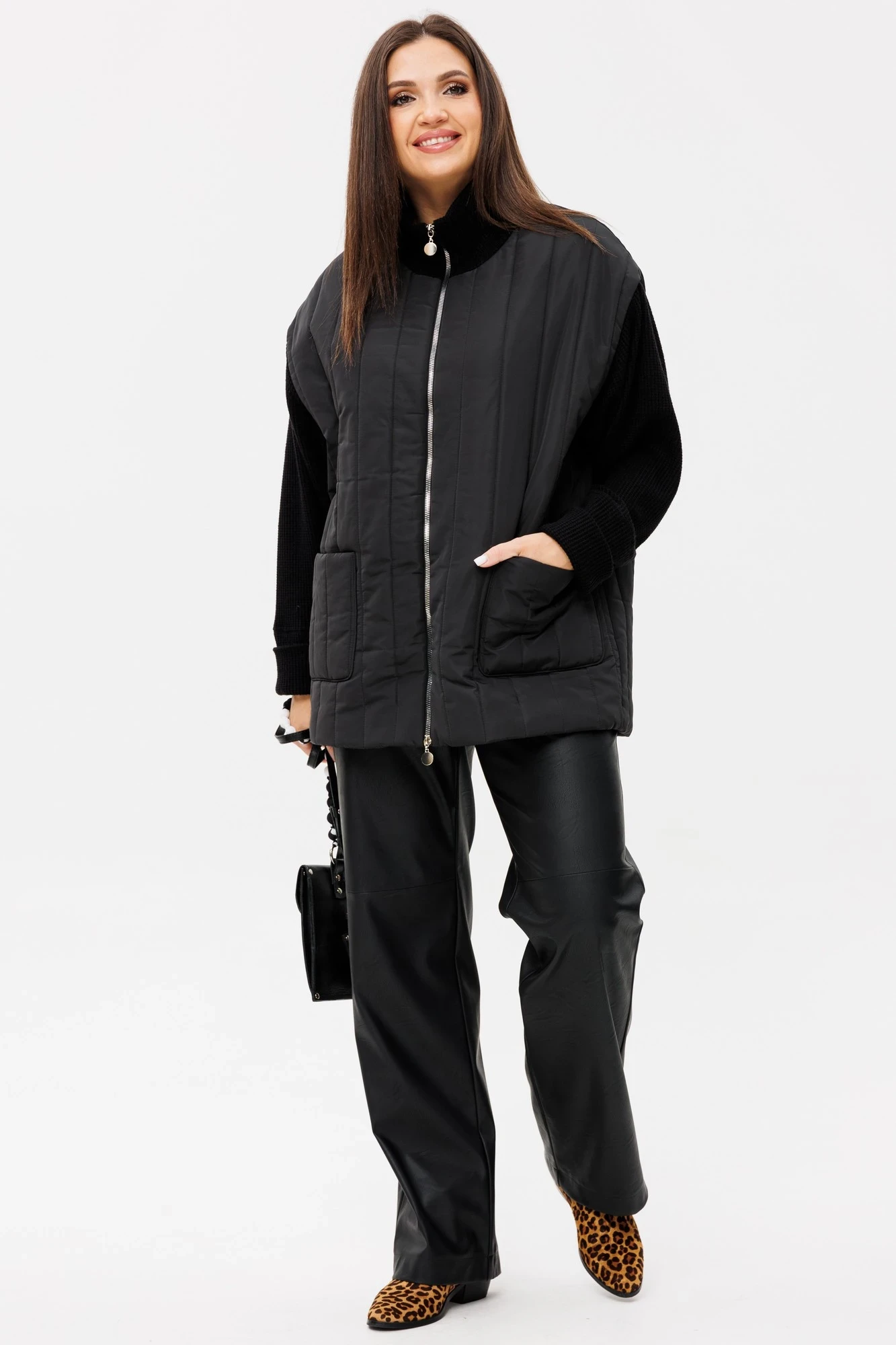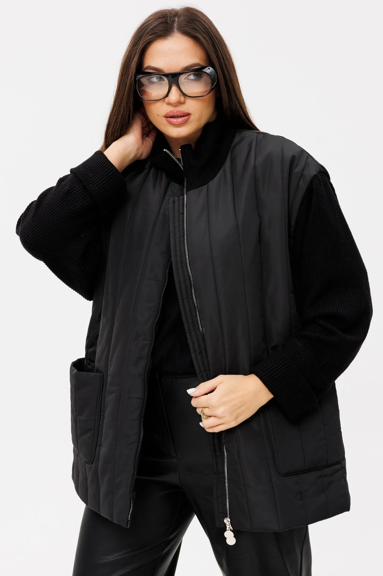 Горловина - стойка из трикотажа. Застежка центральная на молнию. Перед и спинка выполнены из стеганой плащевки, на полочке накладные карманы. Рукава длинные, выполнены из трикотажа, линия плеча спущена.