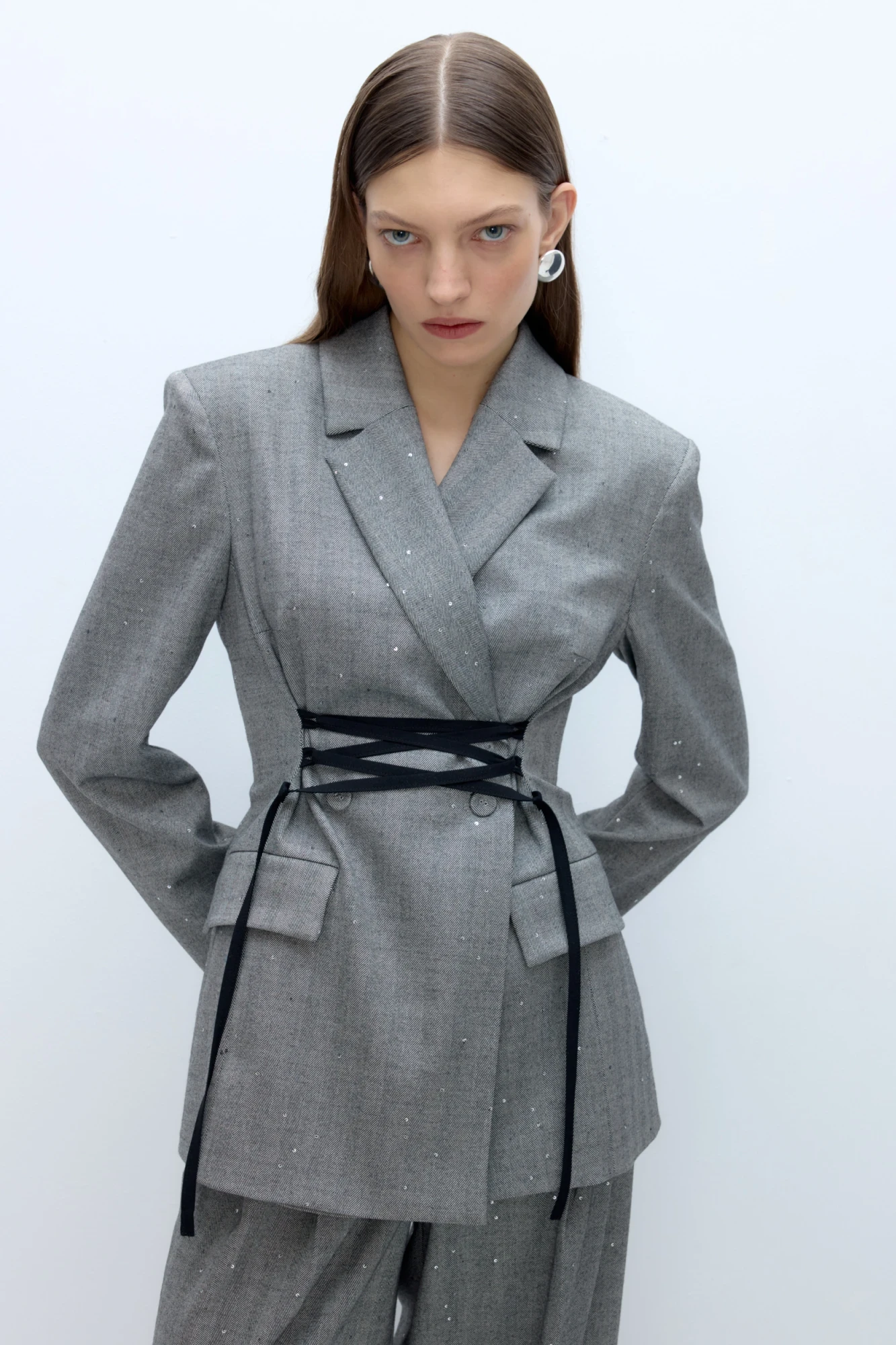 Детали: жакет полуприлегающего силуэта, расширенные плечи, рельефы, пиджачный воротник, застежка на две петли и пуговицы, функциональные карманы, жакет на подкладке. Жакет также можно зашнуровать по бокам.