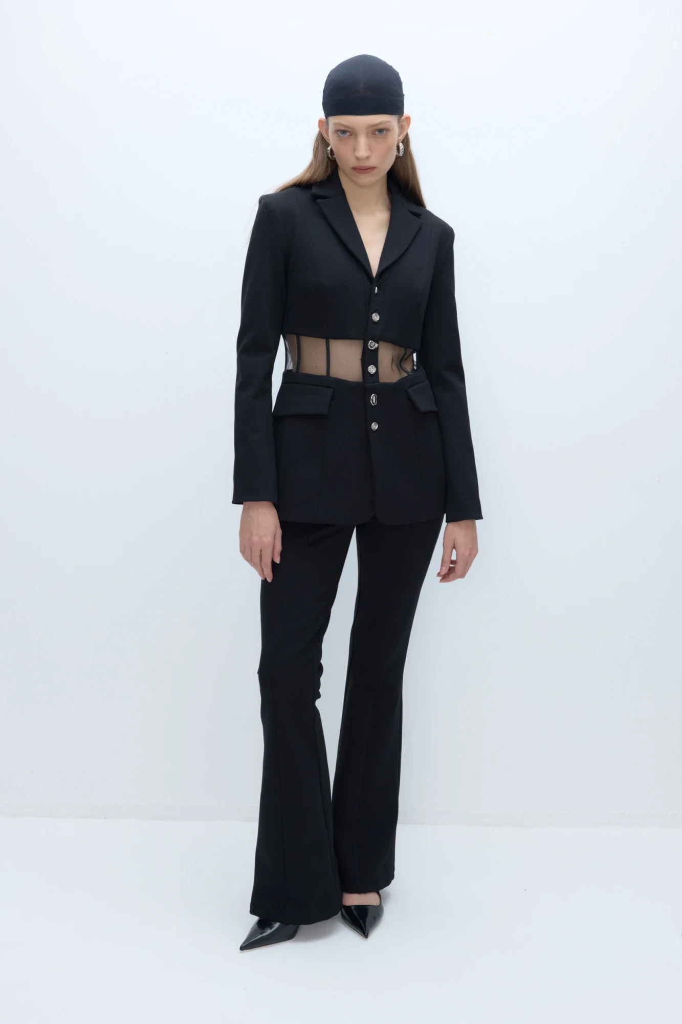Детали: жакет прилегающего силуэта, пиджачный воротник, рельефы, застежка на петли и декоративные пуговицы, функциональные карманы, на подкладке. Жакет выполнен из плотного трикотажа.