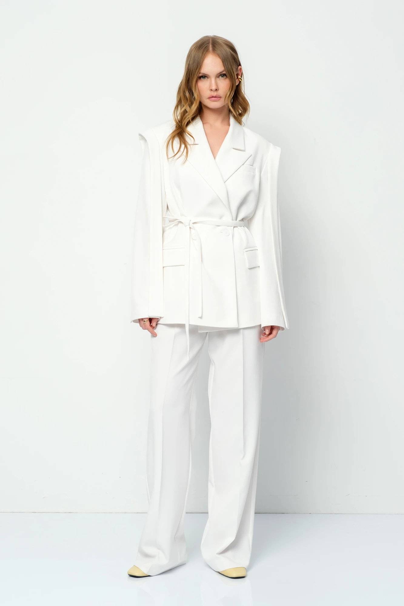 Детали: жакет свободного покроя и полуприлегающего силуэта, двубортная застежка на петли и пуговицы, отрезные бочки, пиджачный воротник, функциональные карманы, съемный пояс. Жакет на подкладке.