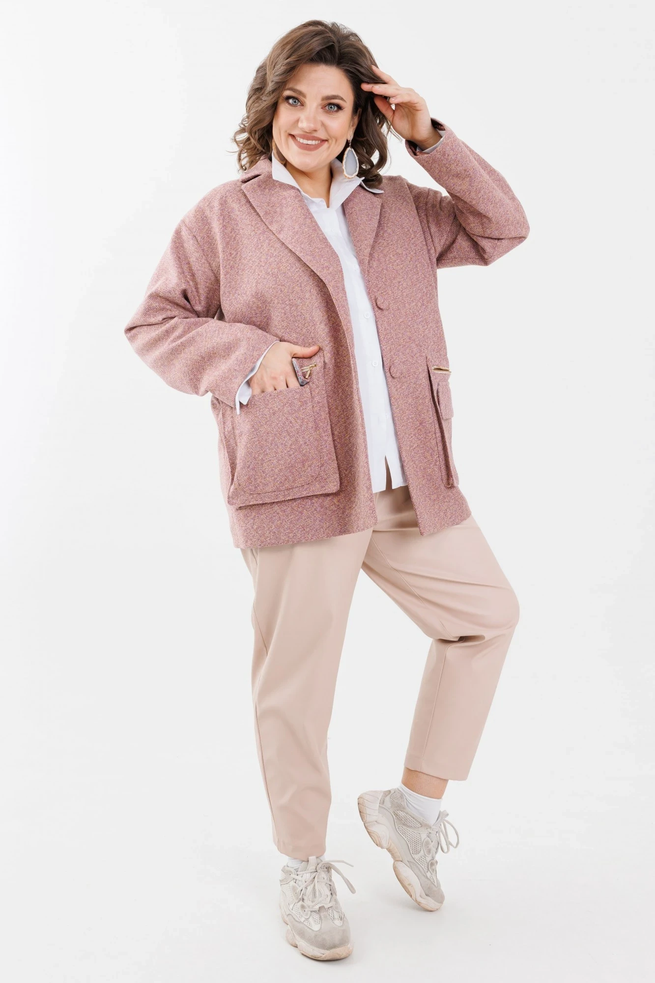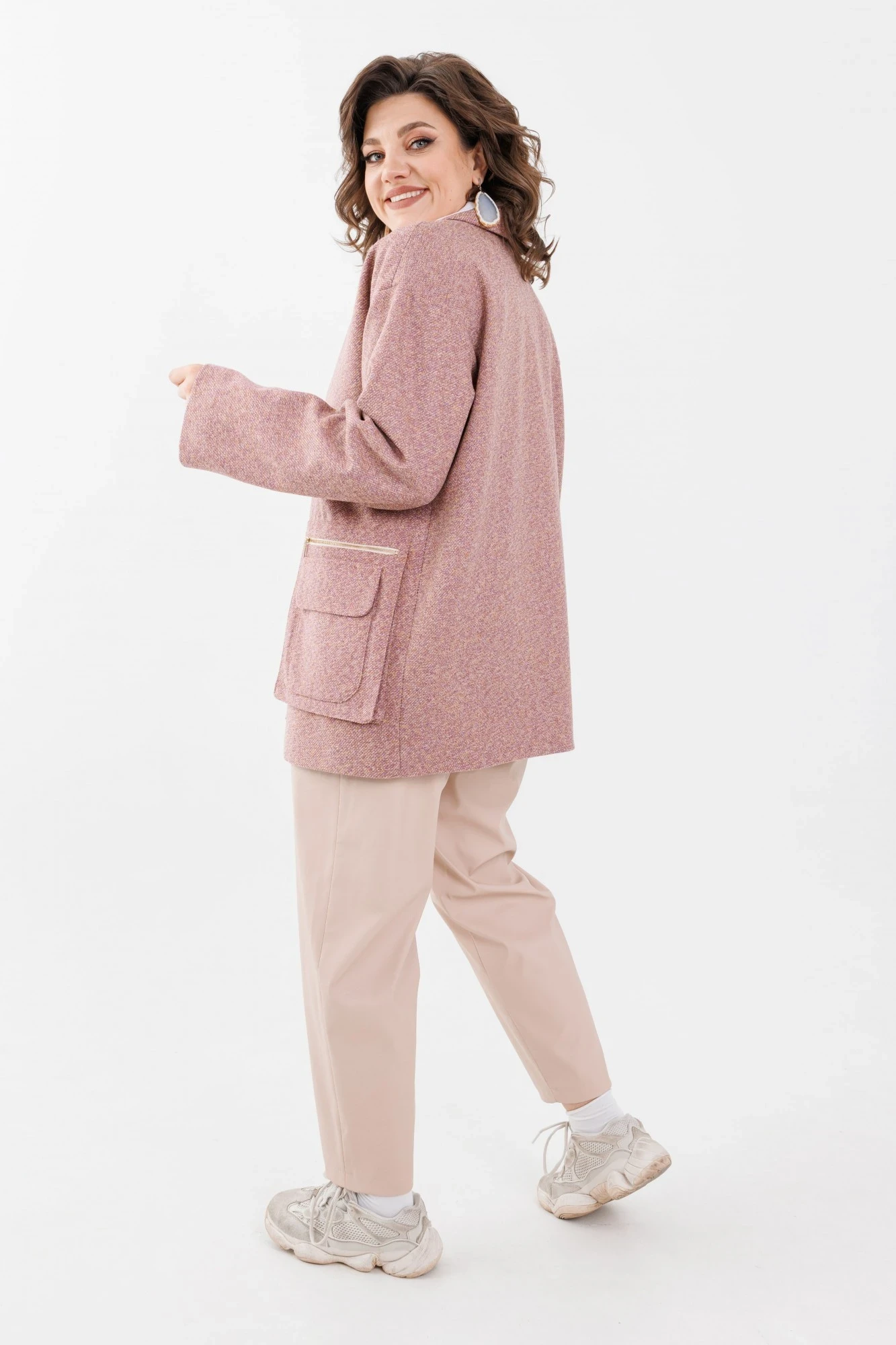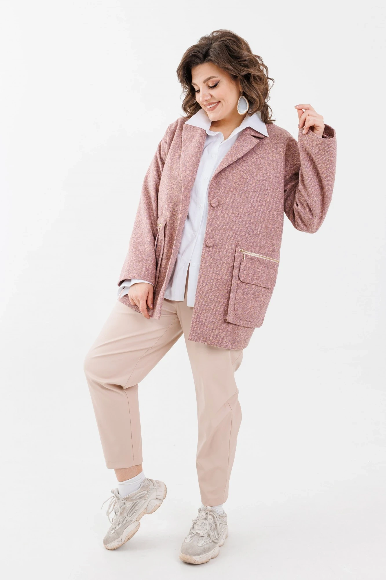 На передней части выполнены нескучные двойные накладные карманы –с внутренними дополнительными на молнии. Спинка цельная. Отложной воротник пиджачного типа. Линия плеча мягкой формы, спущена, рукава втачные, длинные, одношовные. Застежка центральная на потайные пришивные кнопки. Жакет выполнен на подкладке. Металлическая фурнитура в цвете темный никель дополняет изделие.