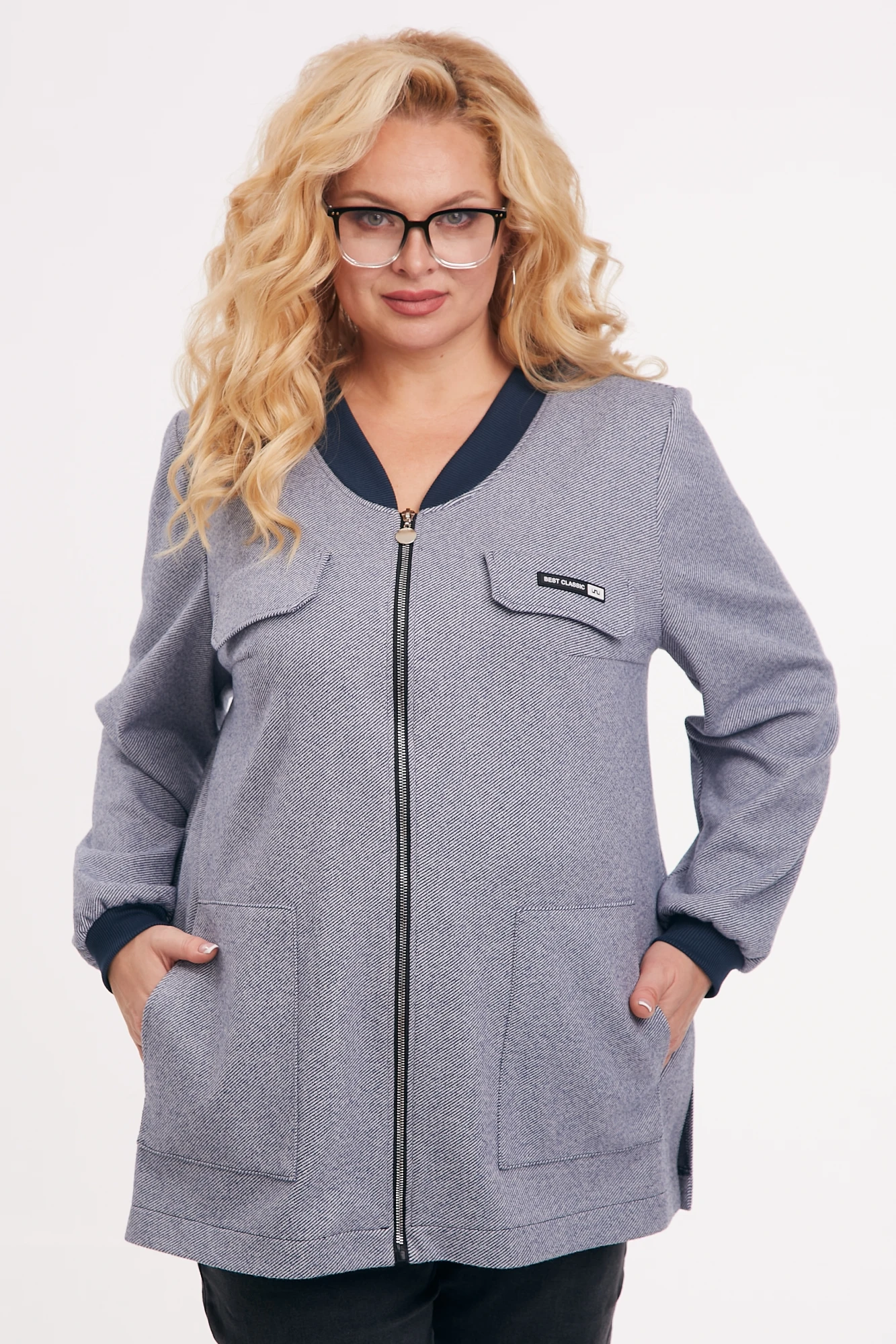 Жакет прямого силуэта с застёжкой на молнию. Перед с нагрудными вытачками, декоративными клапанами, накладными карманами. Спинка цельная. Рукав втачной, длинный, снизу присобран на манжету из довяза. Горловина обработана воротником-стойкой из довяза в стиле бомбера, что придаёт образу современный спортивный акцент. Небольшие боковые разрезы добавляют комфорта и делают силуэт более лёгким.