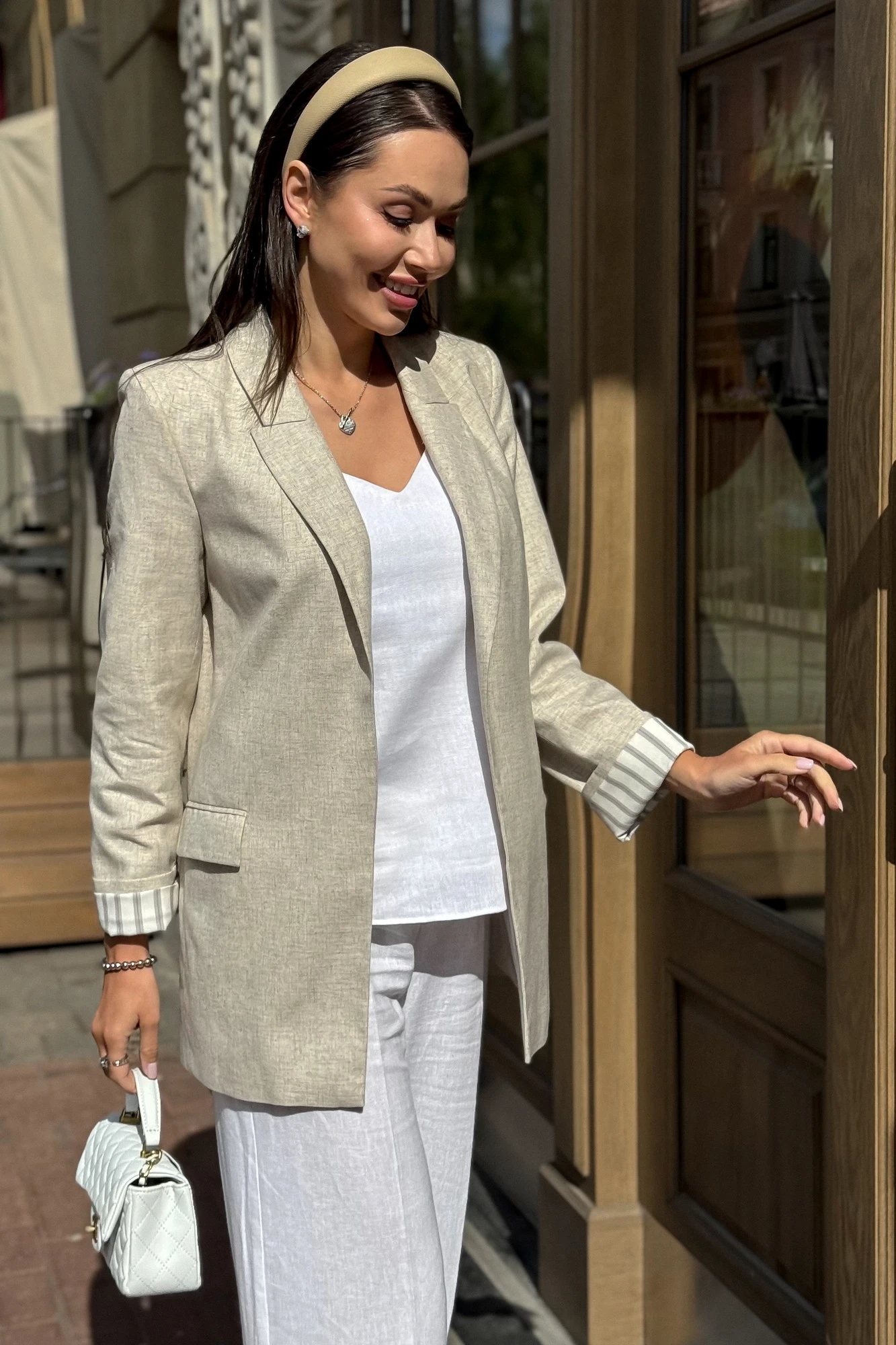 Жакет женский полуприлегающего силуэта из костюмной ткани, с центральной бортовой застежкой встык без петель и пуговиц (в носке эксплуатируется нараспашку) и с отложными лацканами. Жакет на притачной подкладке. Перед жакета с боковыми рельефными швами идущими от проймы до низа изделия и нагрудными вытачками расположенными под лацканами. Перед с прорезными карманами «в рамку» и клапанам, расположенными чуть ниже линии талии. Углы клапана - прямые. Спинка с боковыми рельефными швами от линии проймы до линии низа и со средним швом. Рукава втачные двухшовные, длинные. Низ рукава с заворотом на манжету из отделочной ткани становится длиной 7/8. Плечевой пояс оформлен при помощи плечевых накладок. Воротник пиджачного типа. Углы воротника прямые, лацканы - острые. Края борта с наклонной линией.