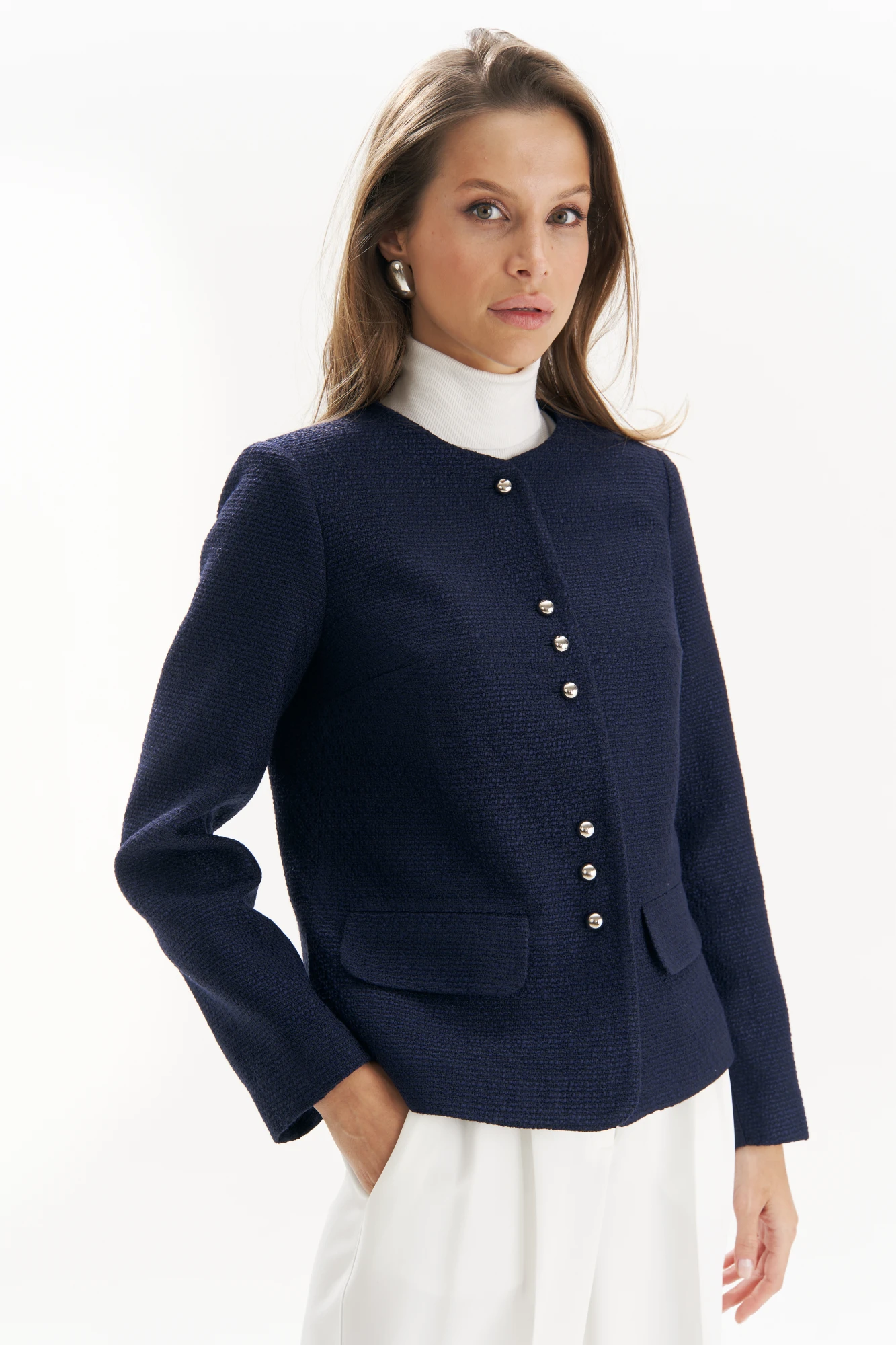Горловина круглая, обтачная. Жакет с плечевыми накладками.